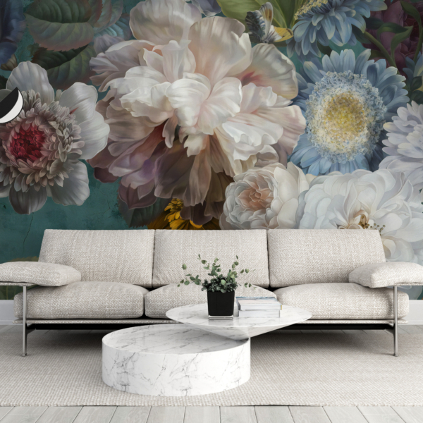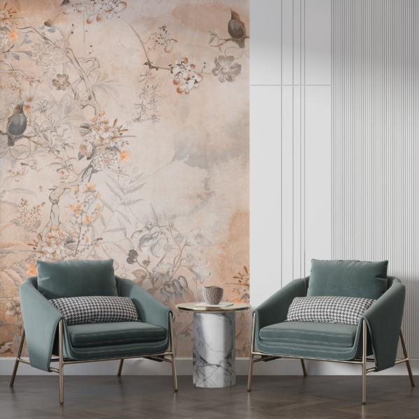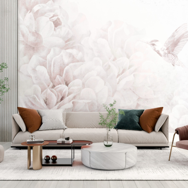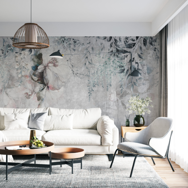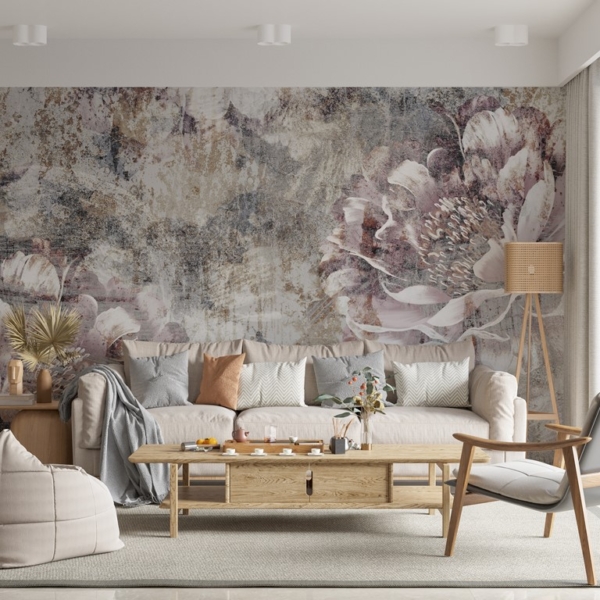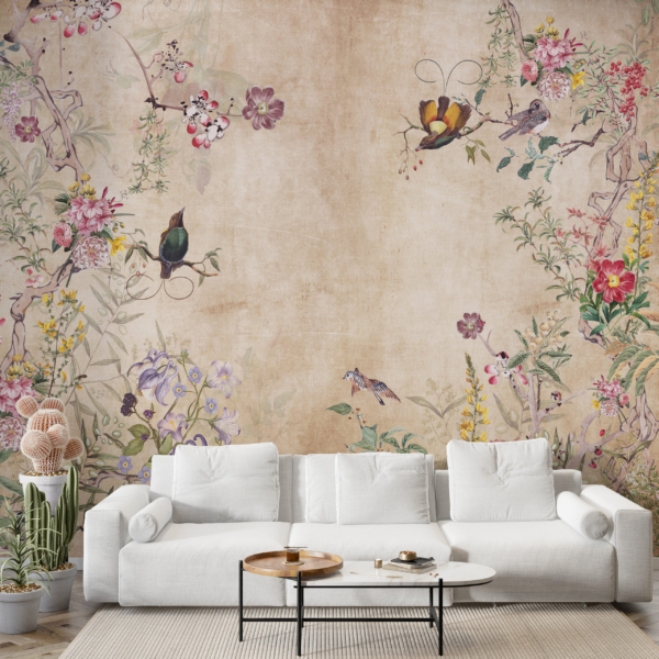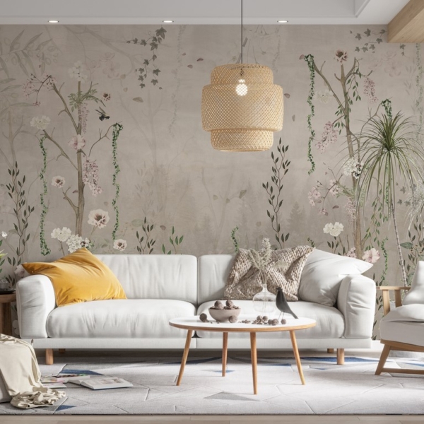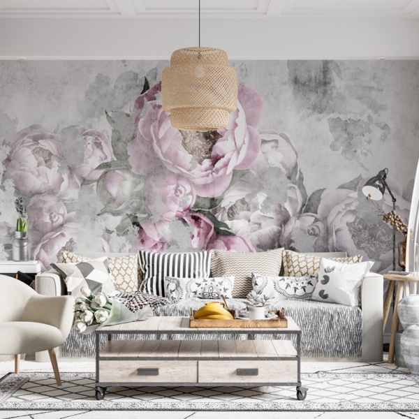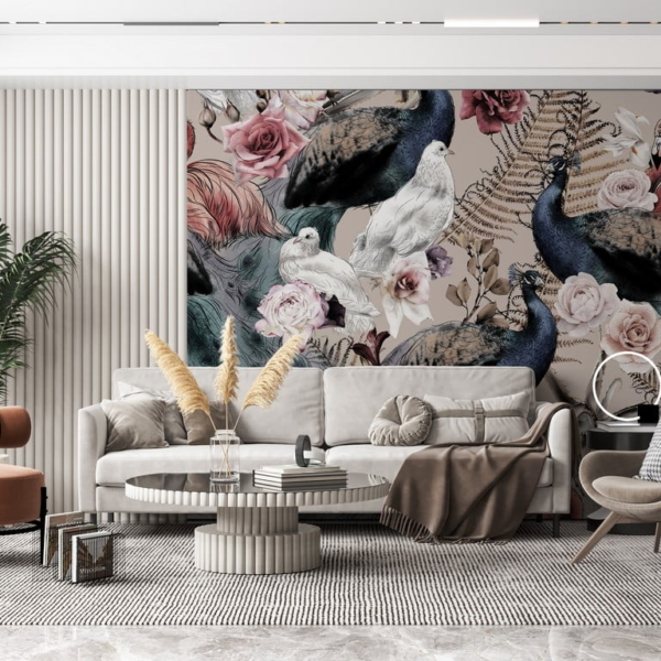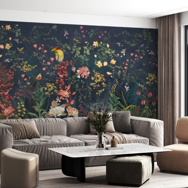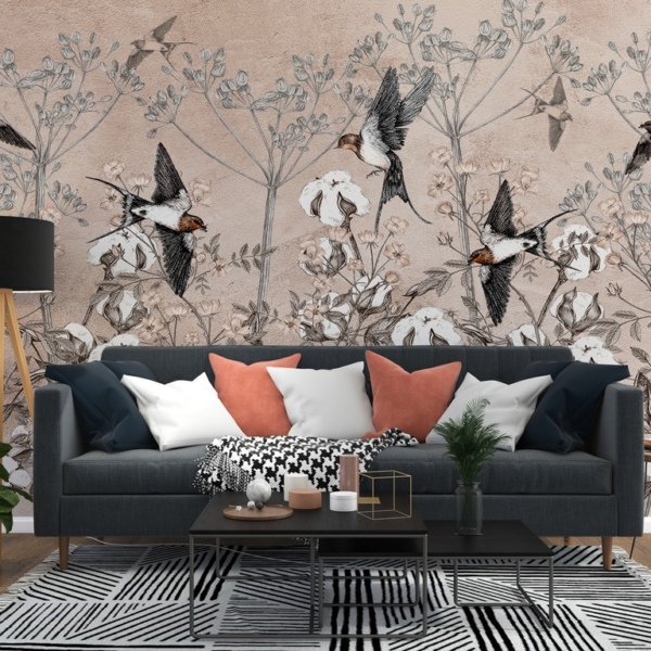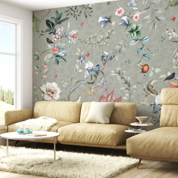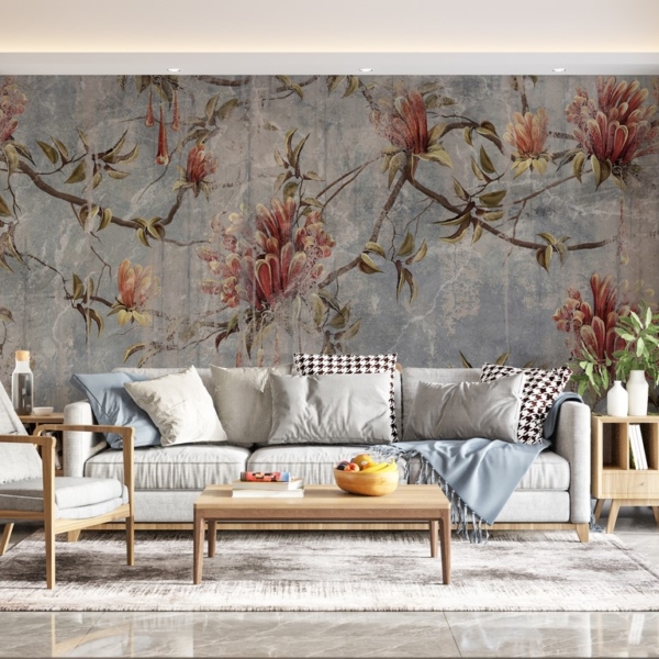 Livfulla blommotiv har en distinkt karaktär, så takt och måttfullhet bör utövas när de införlivas i ett arrangemang. Om du vill att blommiga tapeter i ditt vardagsrum ska vara mittpunkten i din inredning, gå till djärva färger och detaljerade mönster. Stora, tropiska växter med färgglada fåglar eller fjärilar passar bra ihop med inredning i enhetliga, dämpade färger. Delikata, pastellfärgade rutiga mönster ger å andra sidan en bra bakgrund för djärvare designelement – sådana varianter kan också användas med framgång i sovrummet.