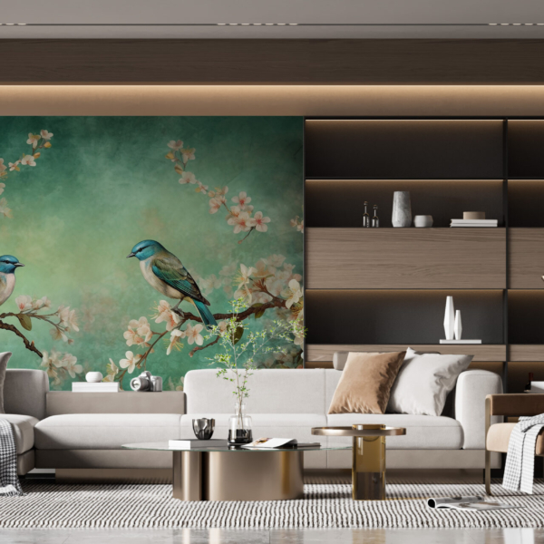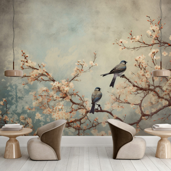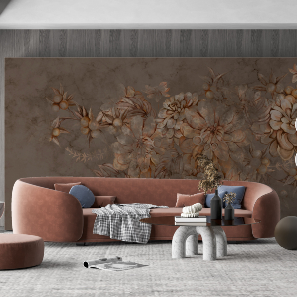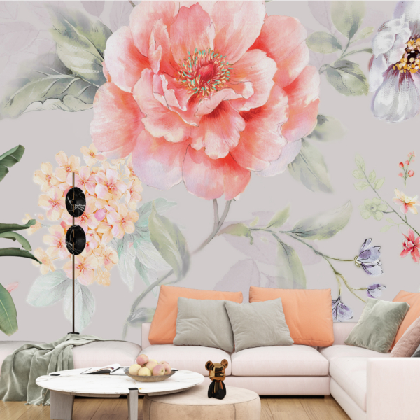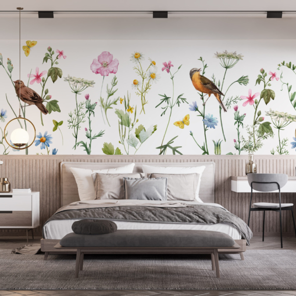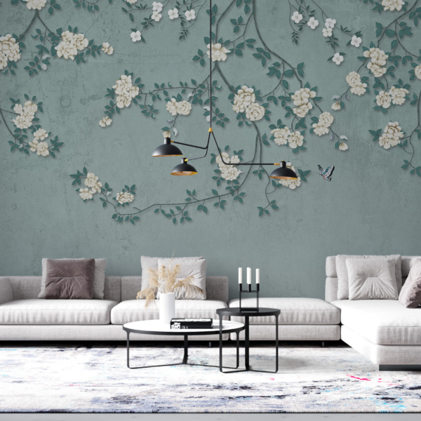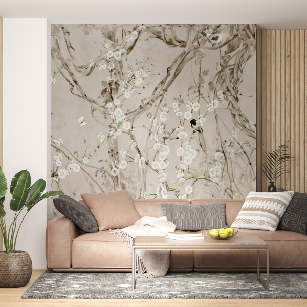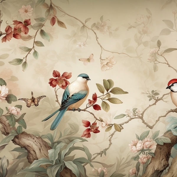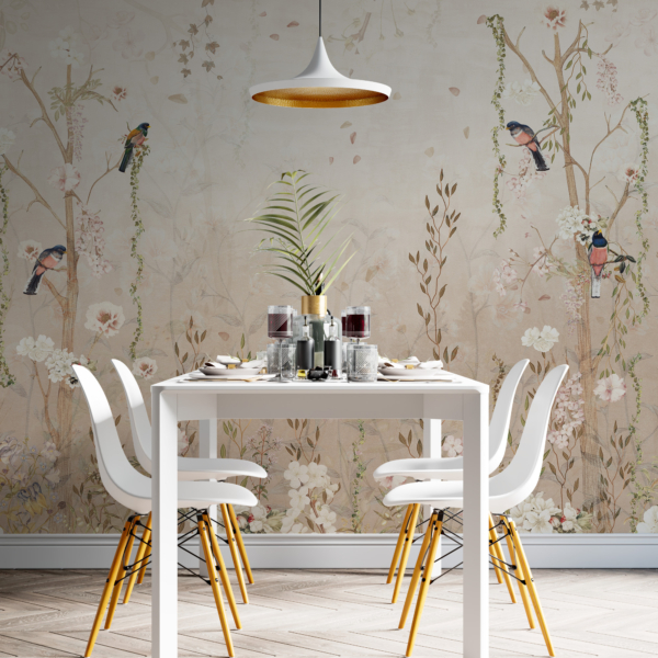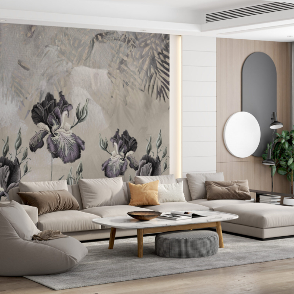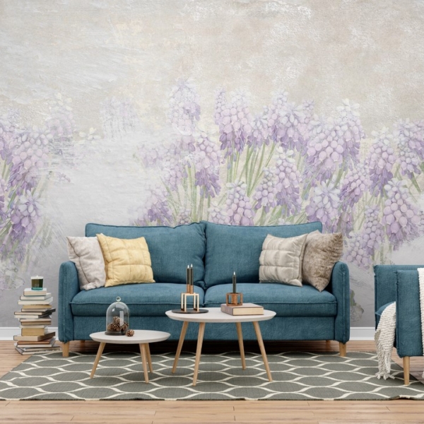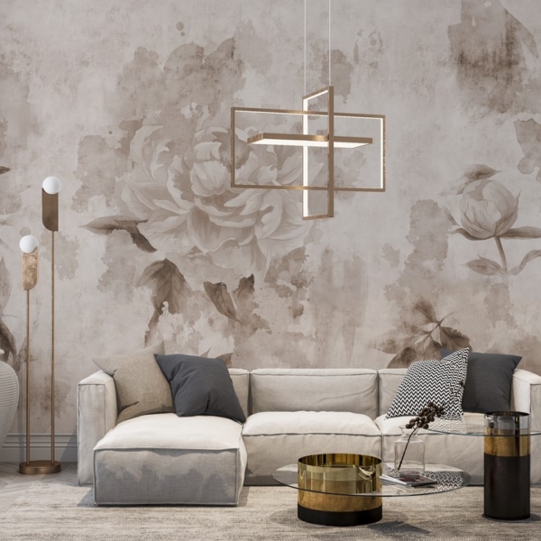 Livfulla blommotiv har en distinkt karaktär, så takt och måttfullhet bör utövas när de införlivas i ett arrangemang. Om du vill att blommiga tapeter i ditt vardagsrum ska vara mittpunkten i din inredning, gå till djärva färger och detaljerade mönster. Stora, tropiska växter med färgglada fåglar eller fjärilar passar bra ihop med inredning i enhetliga, dämpade färger. Delikata, pastellfärgade rutiga mönster ger å andra sidan en bra bakgrund för djärvare designelement – sådana varianter kan också användas med framgång i sovrummet.