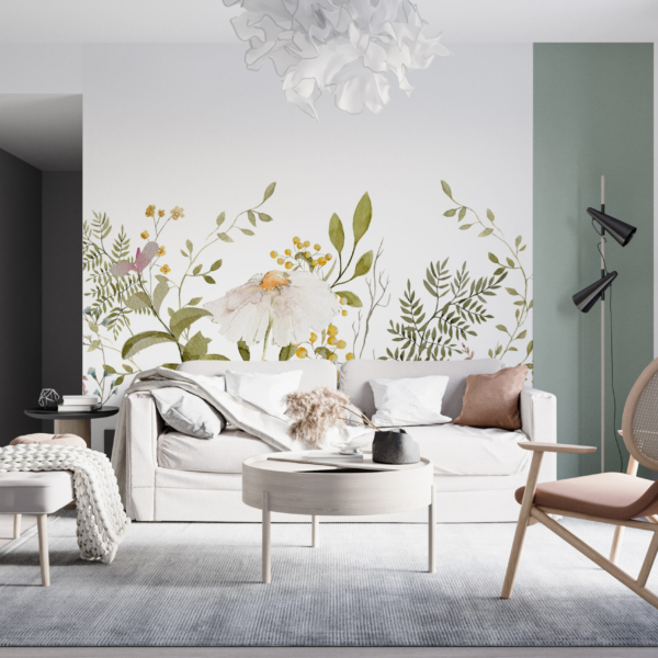 Blommiga tapeter i vardagsrummet – en färgklick eller kontrasterande minimalism?