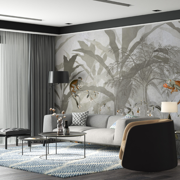 - Produktnummer: 1494960470 En väggmålning som passar alla som älskar monokroma inredningsdetaljer. Färgskalan är svart och vit och ger ett mycket elegant intryck. Lämplig för interiörer i en mängd olika stilar. Den passar bra i ett modernt rum och är också lämplig för interiörer i boho-stil. Den föreställer exotiska djur som gömmer sig i en tropisk djungel. Om du vill få…