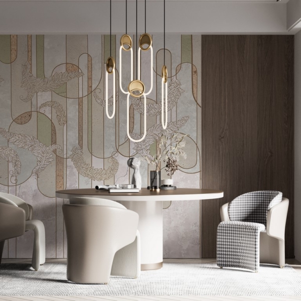 - Produktnummer: 11891998799 En väggmålning designad för de kunder som inte är rädda för originella, oortodoxa mönster. Eleganta blad har integrerats perfekt i det geometriska motivet. Resultatet är en extremt sammanhållen helhet som ger väggen en verkligt unik karaktär. De ljusa, dämpade färgerna innebär att fototapeten inte kommer att överväldiga interiören, och att välja möbler som passar bra med den kommer…