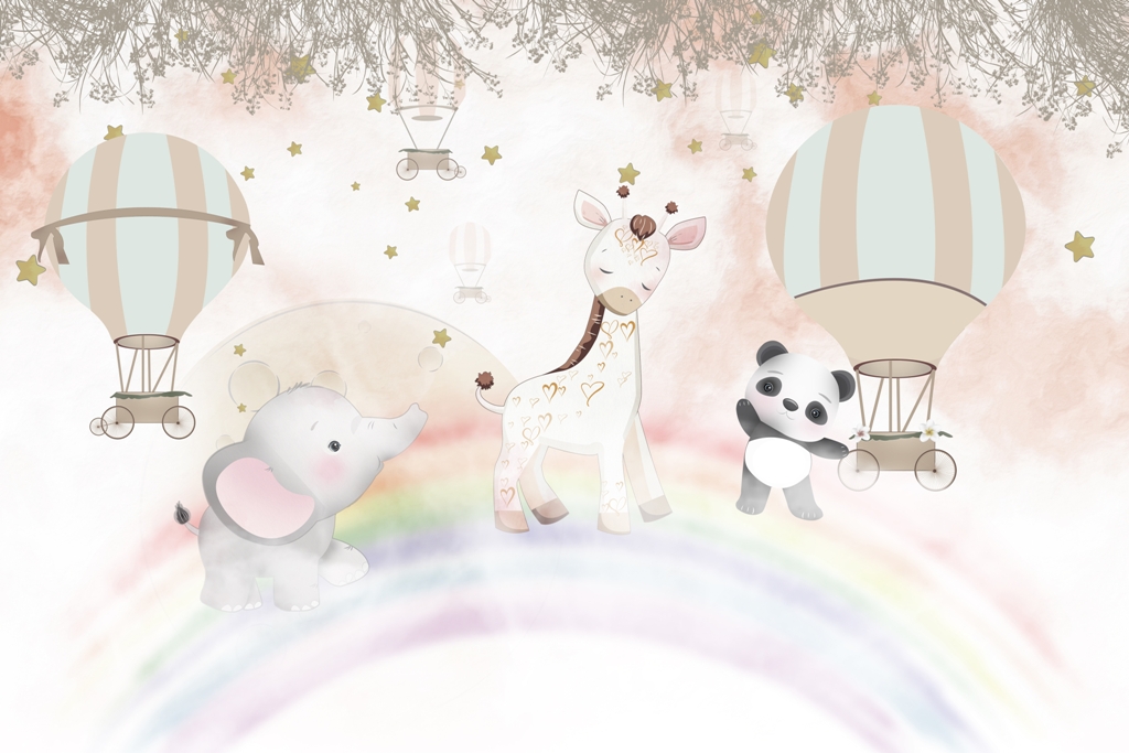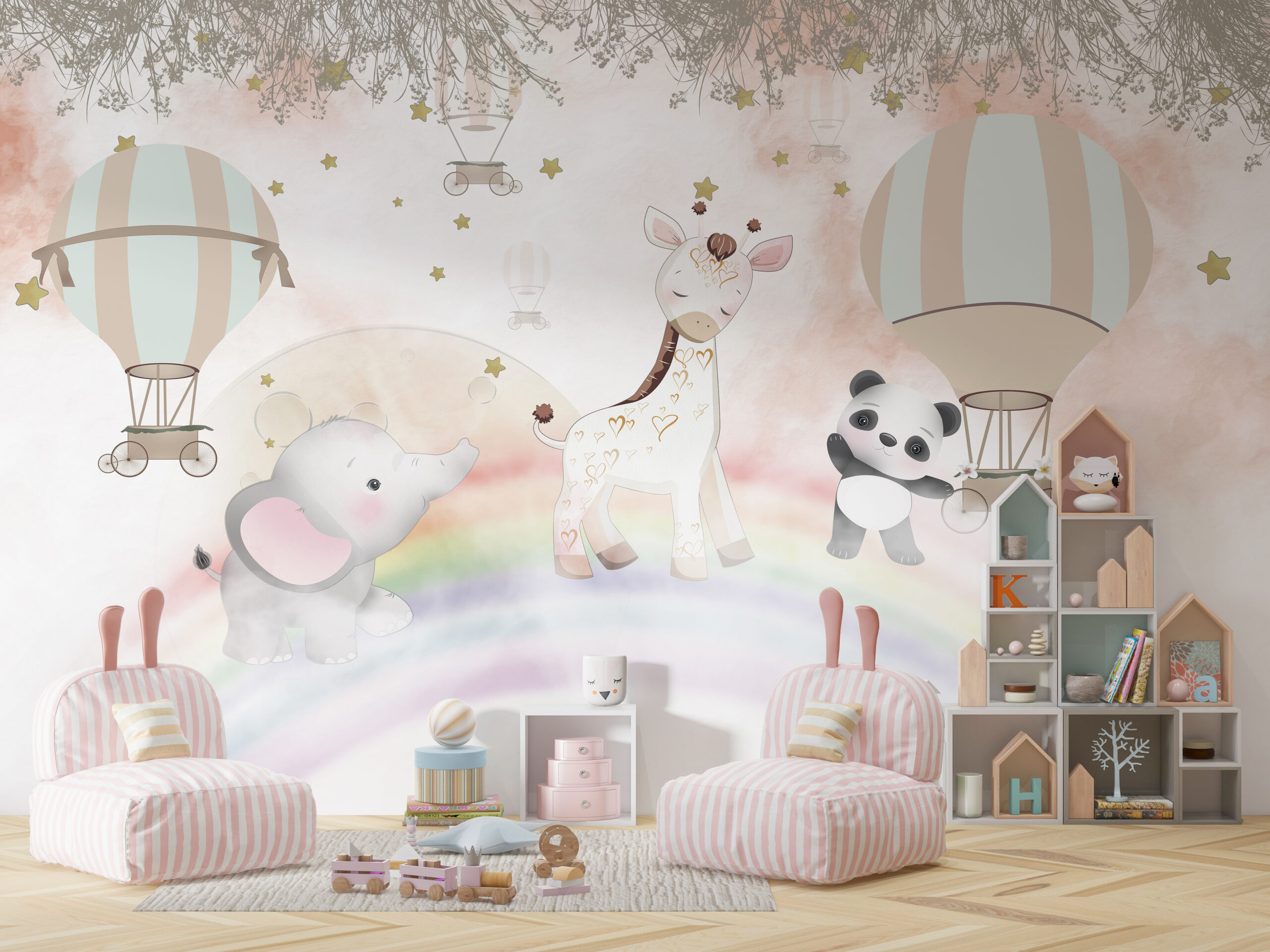 Transportera dig själv till en magisk värld full av färg och charm med denna fantastiska ”Animals on the Rainbow” väggmålning. Perfekt för barnrummet, barnkammaren eller lekplatsen, där den ger en unik atmosfär och glädjer både småbarn och vuxna.