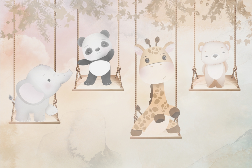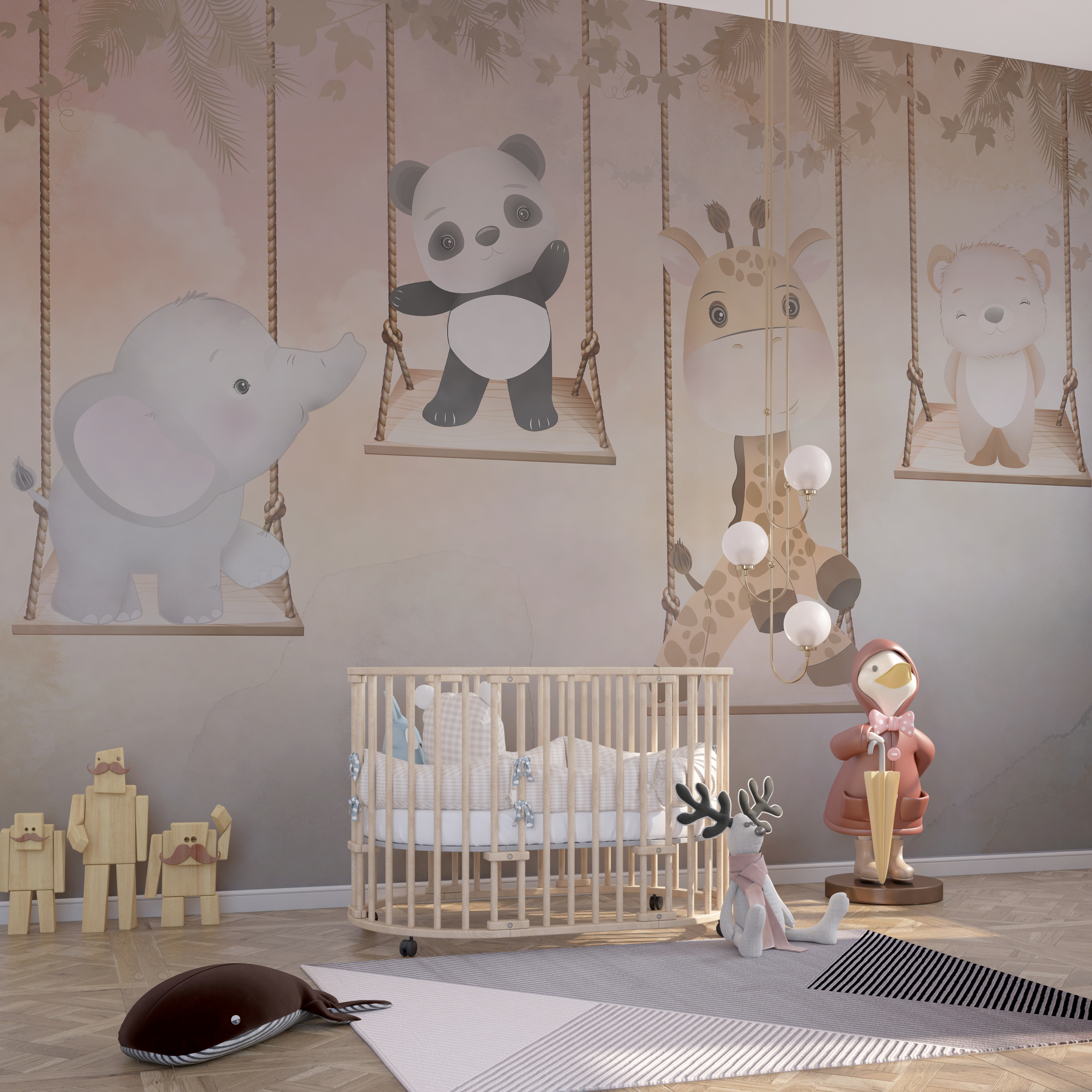 En unik väggmålning som visar söta djur på gungor är det perfekta sättet att liva upp alla interiörer. Perfekt för barnrummet, köket eller vardagsrummet – den ger alla rum en mysig och glad känsla.