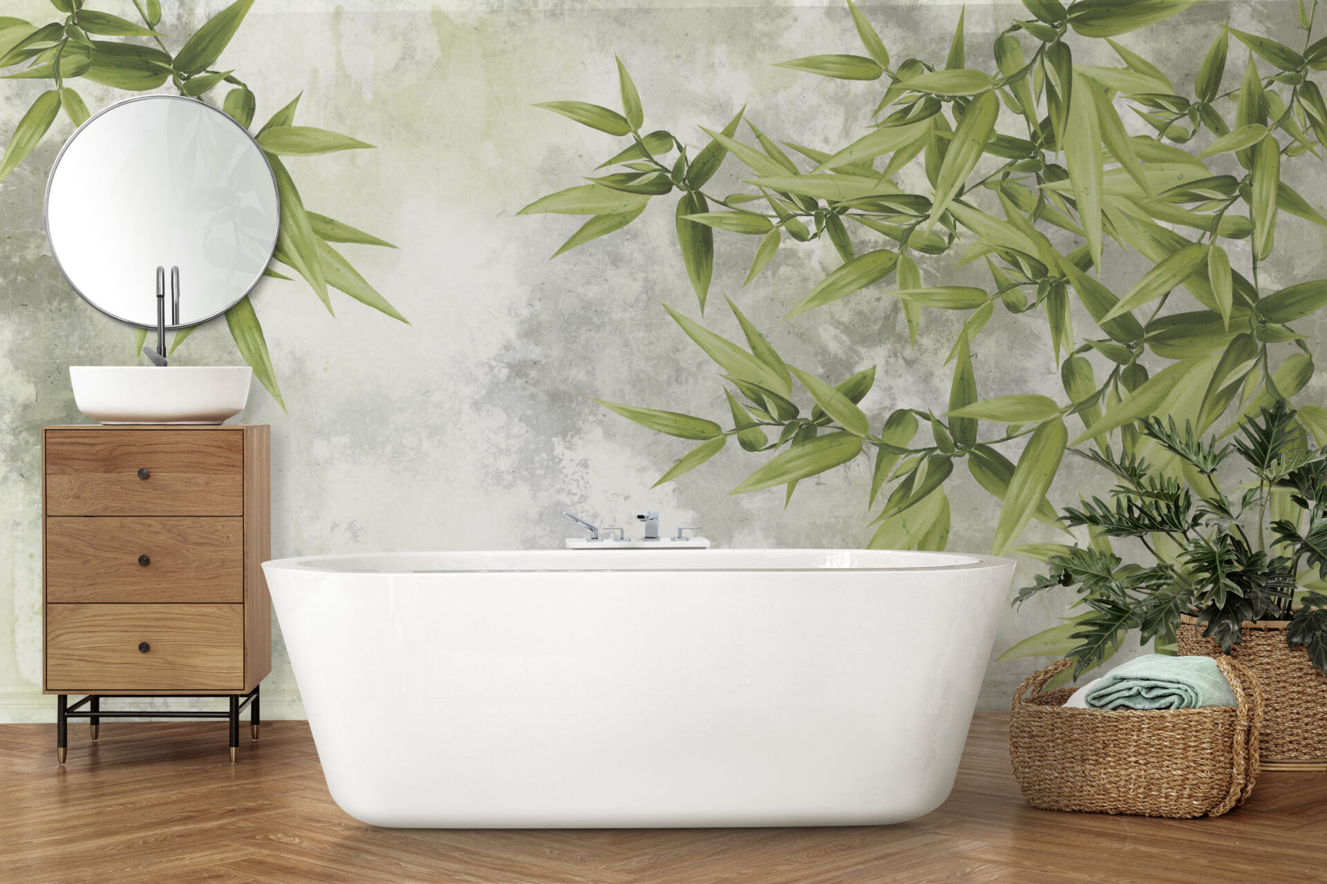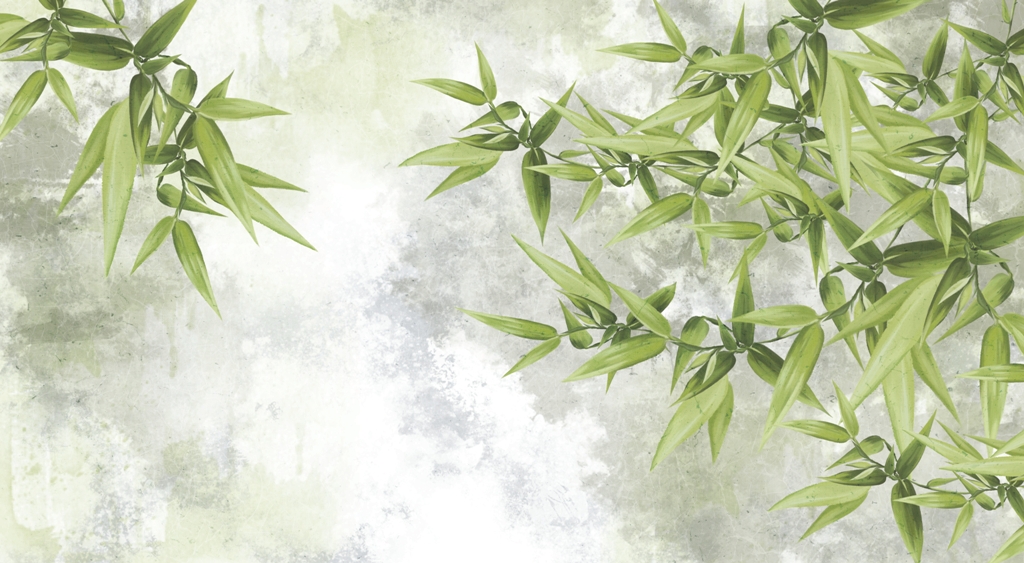 Denna vackra väggmålning visar känsliga gröna blad mot en grå himmel, vilket ger rummet ett subtilt och naturligt utseende. Lövverket har fångats i sin fulla prakt och detaljerna är perfekta, vilket skapar en harmonisk och fridfull atmosfär.