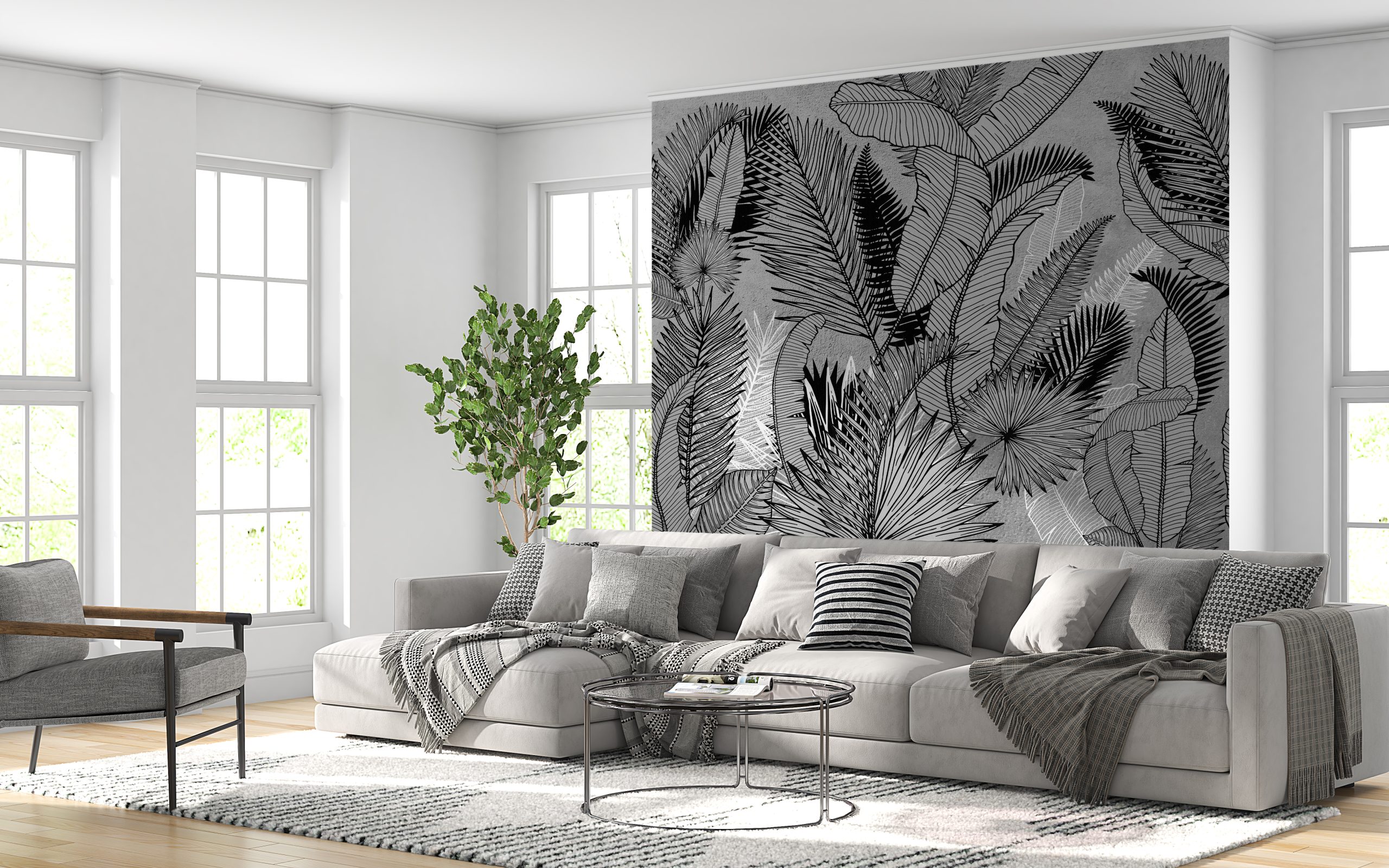Letar du efter en ovanlig dekoration för din inredning? Denna väggmålning med ett bladmotiv på en grå bakgrund kommer att vara ett utmärkt val! Dess originella design ger din inredning en modern och elegant känsla.