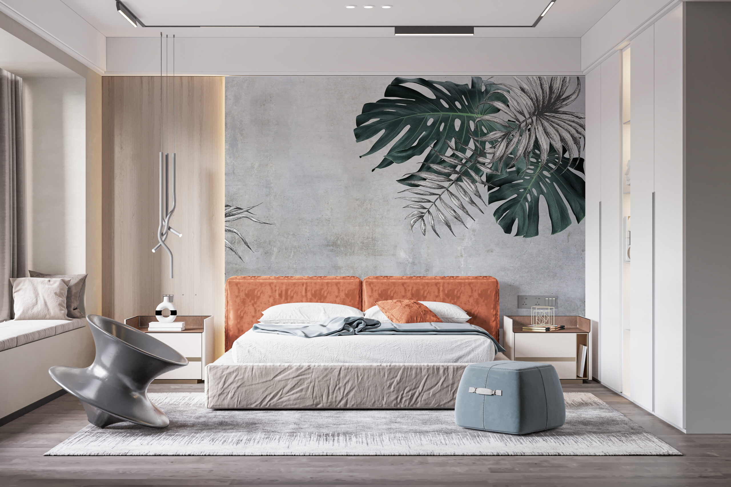 Denna väggmålning har realistisk palmgrafik som ger en fräsch och naturlig charm till din interiör. Tack vare de mättade gröna färgerna kommer rummet att få nytt liv och ny energi.