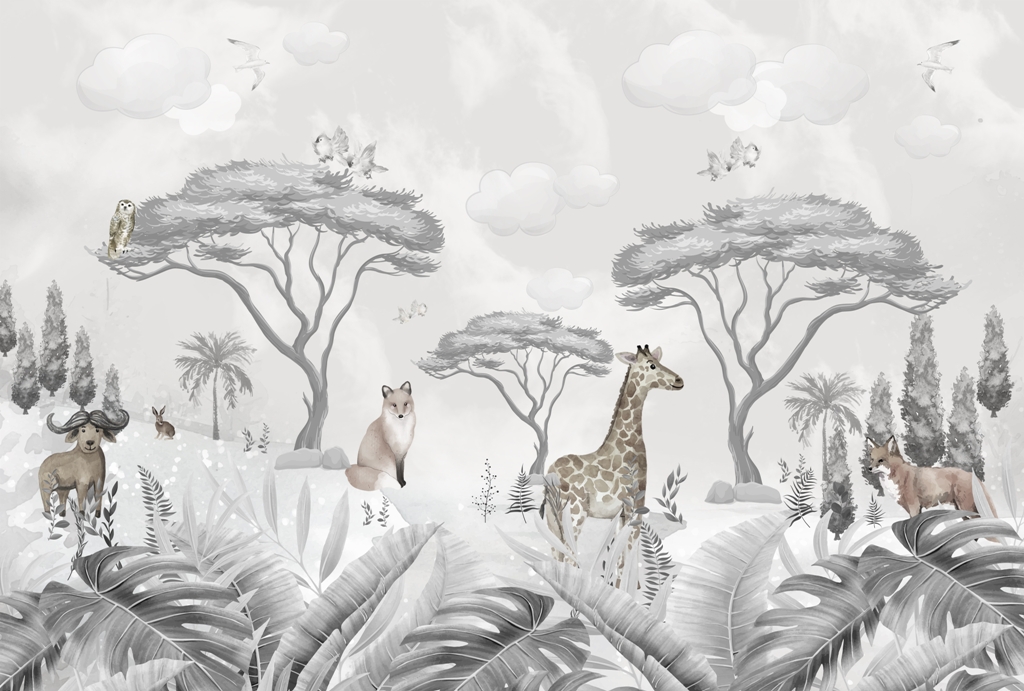 Denna fototapet är designad med de små i åtanke och föreställer vilda djur i en naturlig miljö. Den går i grå nyanser, vilket gör den till ett bra val för både pojk- och flickrum. Placerad på väggen blir den den perfekta bakgrunden för många barnlekar. Tillverkad med största omsorg. Det gör att den inte bara ser bra ut, utan också är mycket hållbar. När du köper den kan du vara säker på att den kommer att följa med ditt barn under lång tid.