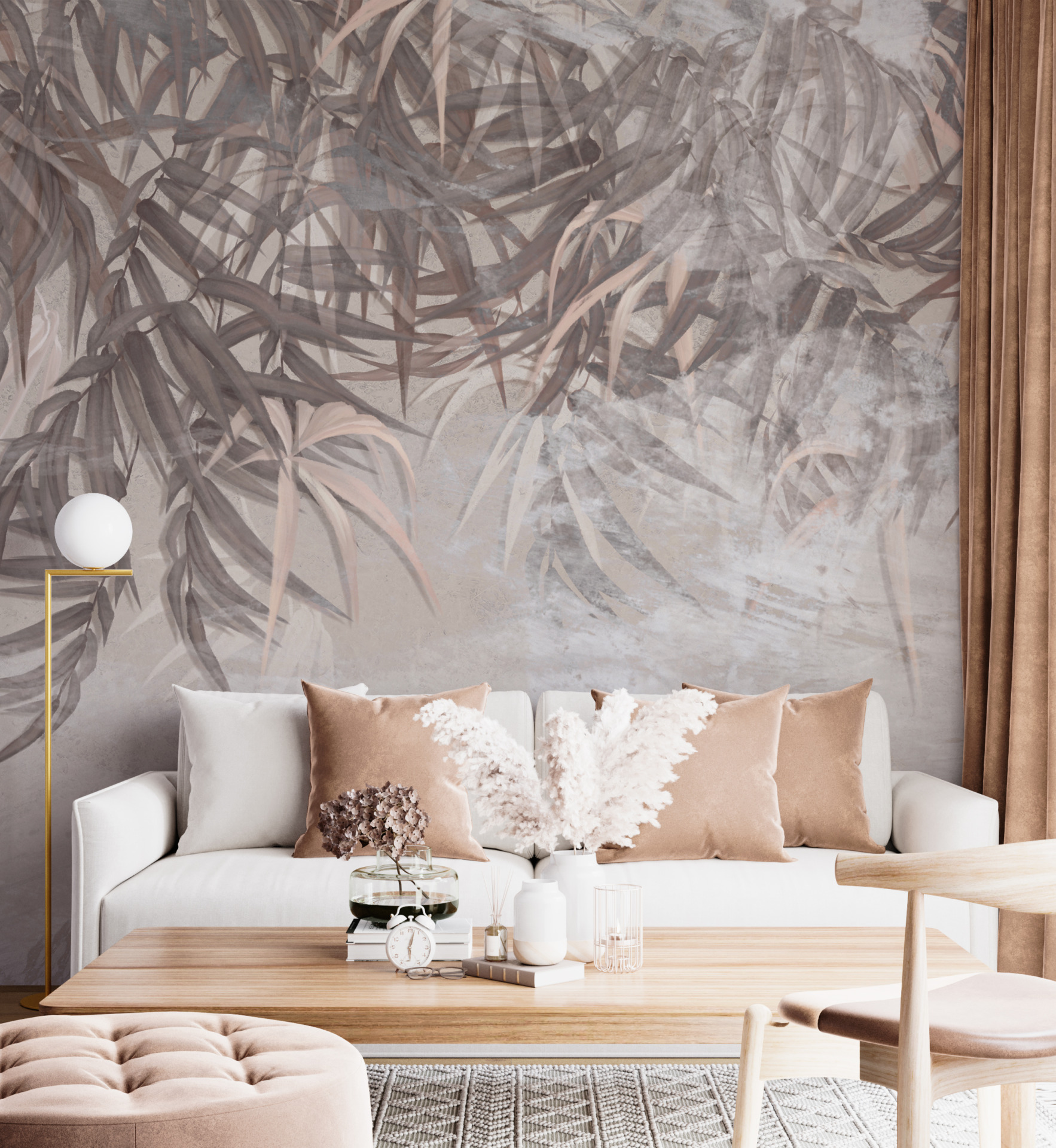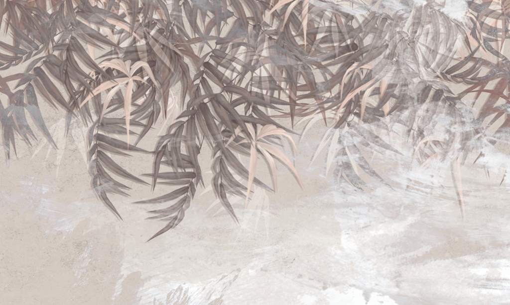 Denna charmiga väggmålning föreställer monokroma tropiska blad, vars minimalistiska design ger elegans och friskhet till alla interiörer. Den är perfekt för vardagsrummet, sovrummet, kontoret eller till och med en restaurang och ger rummet en subtil, exotisk känsla.