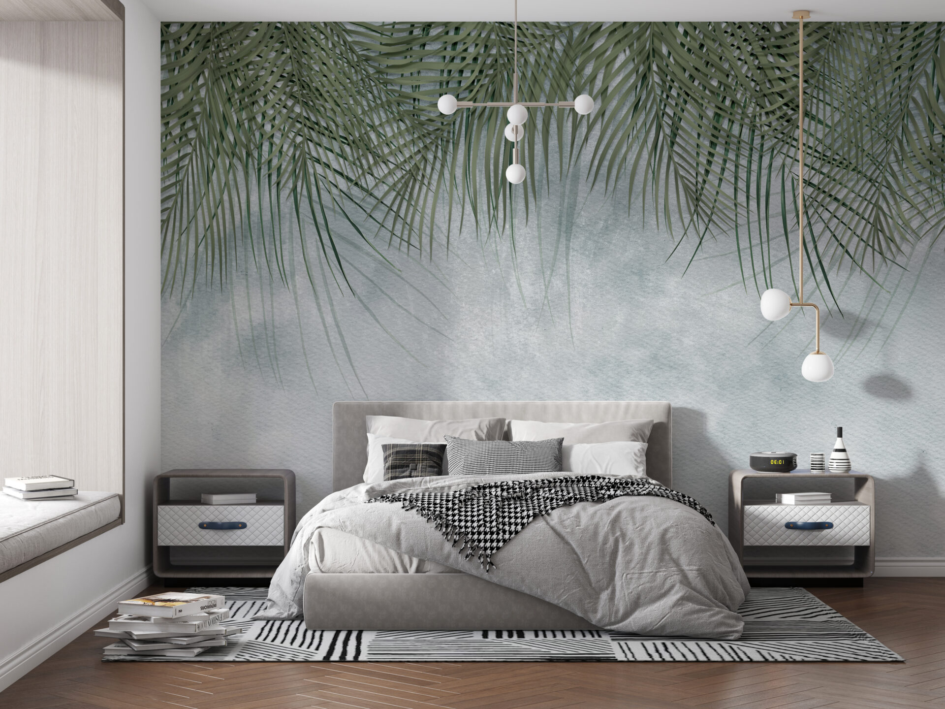 Denna väggmålning föreställer palmblad som flyter över en exotisk strand och skapar en avkopplande och charmig utsikt i ditt hem. Med sina livfulla gröna färger och detaljerade detaljer kommer du att känna dig som på en ö i paradiset varje dag.