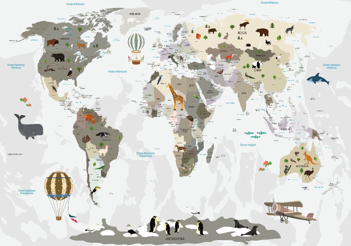 Världskartan på polska på fototapeten kommer inte bara att vara en dekoration av ditt utrymme utan kan också vara ett bra pedagogiskt verktyg för barn eller ungdomar. Det kommer att göra det möjligt för dem att bekanta sig med namnen på länder, huvudstäder och geografiska platser på världskartan.