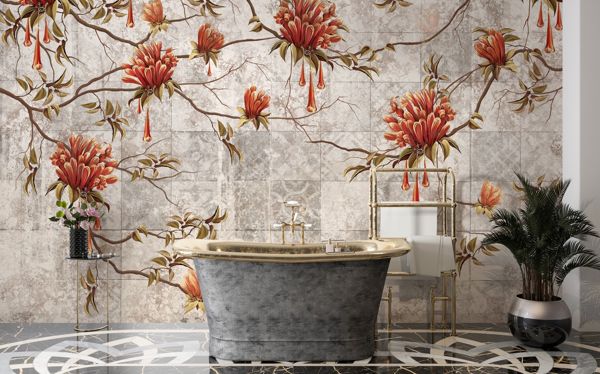 Träd är ett mycket populärt motiv inom inredningsdesign eftersom de symboliserar styrka, stabilitet och naturlighet. Det blommande trädet på plattorna är en kombination av modernitet (tack vare plattornas form) och det traditionella, naturliga motivet av ett blommande träd.