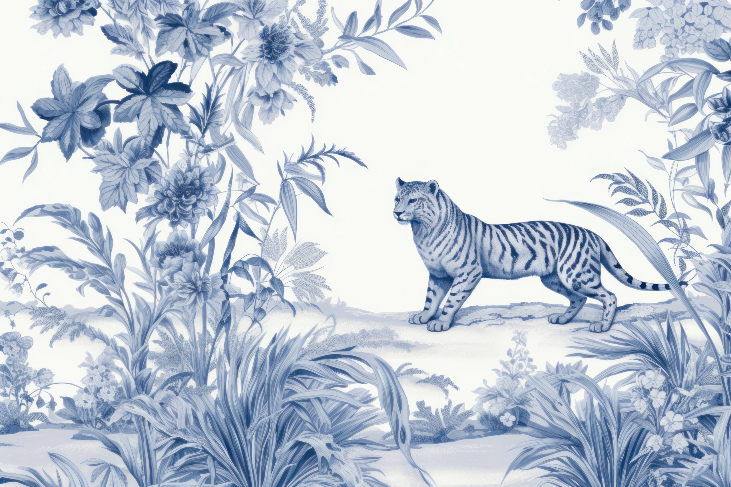 Liv upp din inredning med fototapeten ”Blå Djungel” – en unik komposition inspirerad av motivet från kinesiskt porslin. Denna blåvita illustration kombinerar den exotiska skönheten i den vilda naturen med delikatessen hos blommiga detaljer, vilket skapar en bild som glädjer med både subtilitet och uttryckskraft. Tigerns centrala figur utstrålar lugn självförtroende, och den frodiga vegetationen som omger den ger helheten en känsla av djup och harmoni.