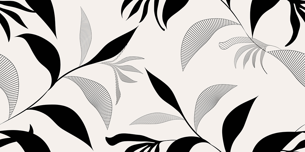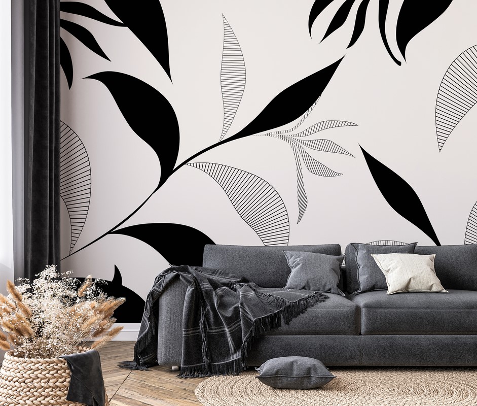 Etiketter: kontrast, löv, lövtapet, svart, tapet med växtmotiv, väggdekoration, vardagsrumstapet, växtaccent i interiören