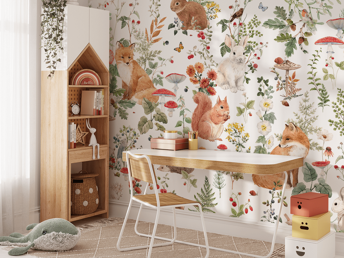 Söta detaljer och glada färger gör denna fototapet perfekt för ett barnrum och skapar ett varmt, mysigt och inspirerande utrymme för lek, lärande och avkoppling. Det är ett fantastiskt sätt att få in skogens och naturens naturliga charm i din inredning.