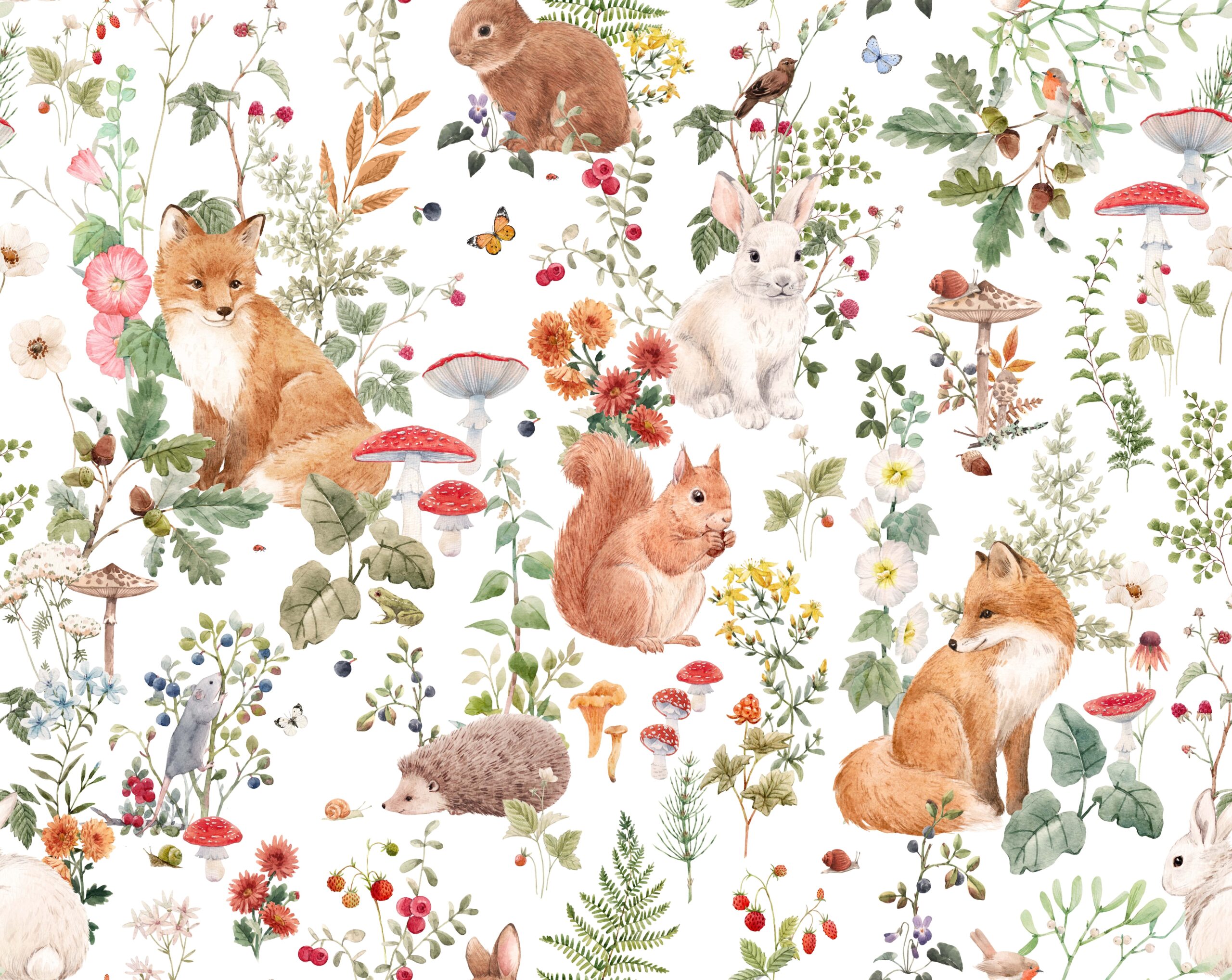 Förvandla ditt barns rum till ett förtrollat land med fototapeten ”Among Mushrooms and Flowers”. Detta charmiga mönster är fullt av glada djur, färgglada blommor och skogssvampar som väcker barns fantasi och uppmuntrar dem att upptäcka naturens värld.