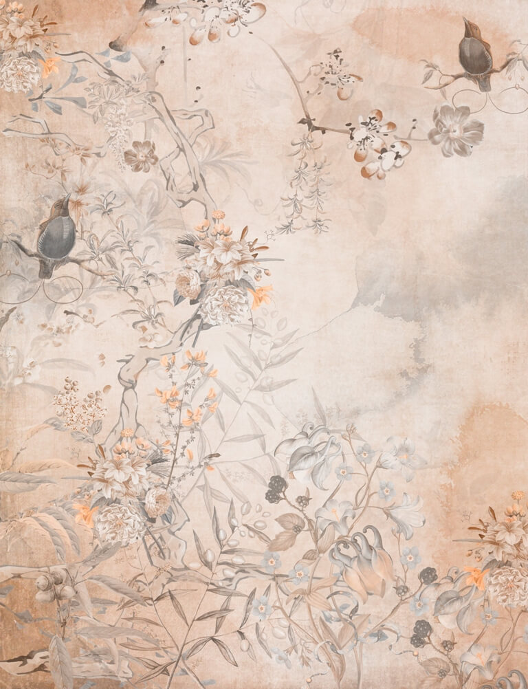 Denna väggmålning har känsliga blommor i pastellfärger som kompletteras av fåglar som sitter på grenar. Denna harmoniska komposition gör din inredning mer ombonad, full av liv och glädje.