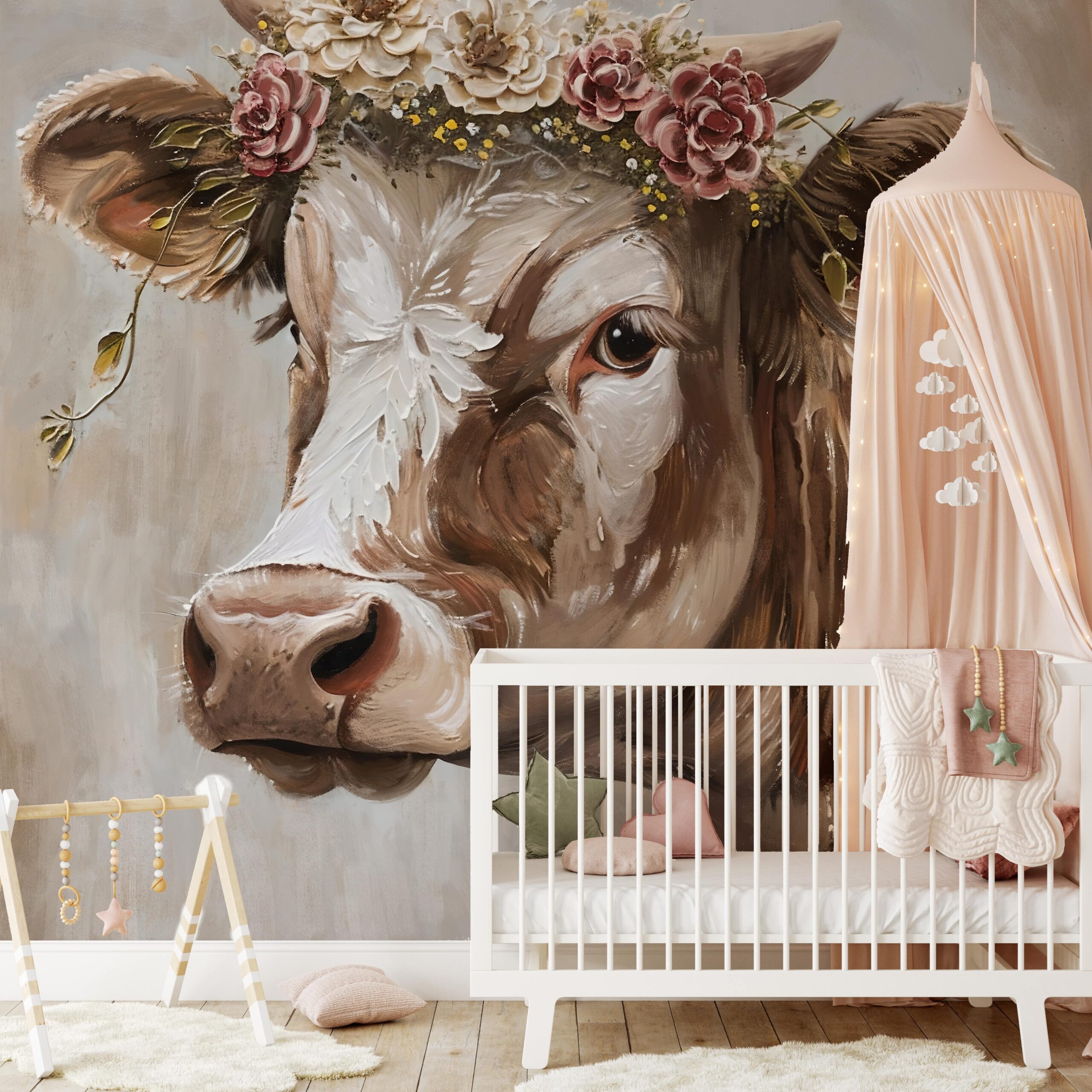 Skapa en magisk atmosfär i ditt barns rum med fototapeten ”Flower Patch”. Detta charmiga mönster som föreställer en vänlig ko med en blomsterkrans är den perfekta kombinationen av idyllisk charm, pastellfärger och ett barns fantasi. Fina penseldrag, mjuka färger och ett glatt djurmotiv skapar ett mysigt utrymme där varje barn känner sig tryggt och glädjefyllt.