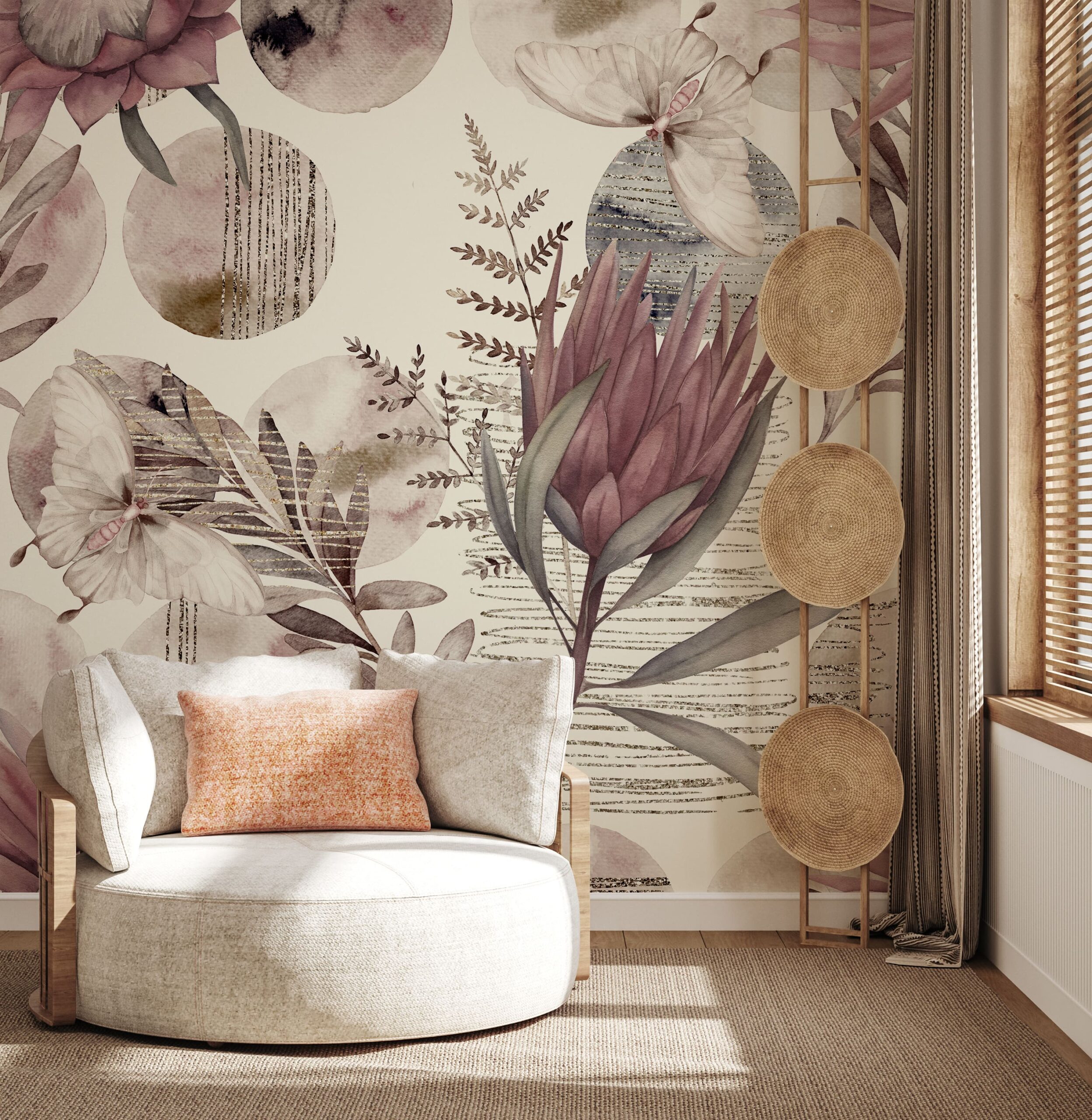 Inför en unik atmosfär i din interiör med fototapeten ”Botanical Melody”. Detta delikata akvarellmönster inspirerat av naturen kombinerar motiv av blommor, löv och fjärilar med mjuka, dämpade färger i rosa, beige och grått. Berikad med gyllene detaljer och grafiska texturer skapar kompositionen en elegant och atmosfärisk atmosfär full av grace.