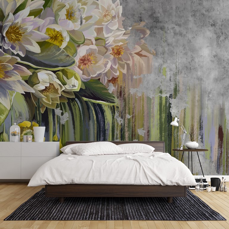 Föreställ dig en vacker bukett med vita näckrosor i din interiör med denna charmiga väggmålning. Fina blommor blommar på väggen och ger elegans och fräschör till alla rum.