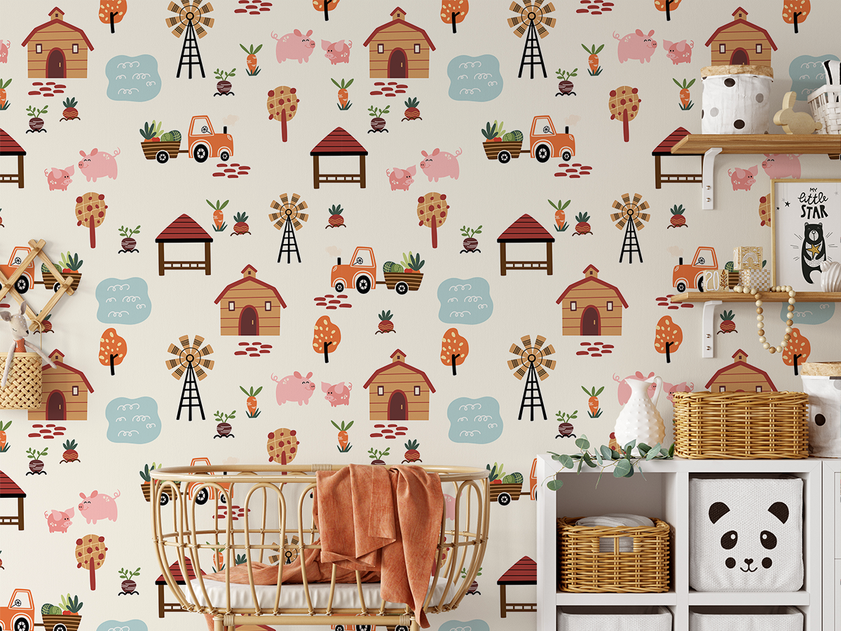Fördjupa ditt barn i en varm, lantlig atmosfär full av leende grisar, färgglada grönsaker och glada traktorer med fototapeten ”Charmig bondgård”. Detta vänliga och detaljerade mönster transporterar de yngsta till naturens bekymmerslösa värld, där vardagen är fylld av skoj och upptäckter i omvärlden.