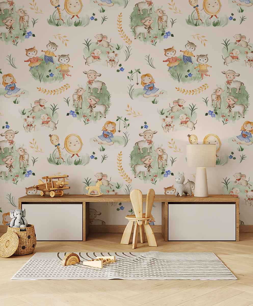 Förvandla ditt barns rum till ett magiskt land med fototapeten ”Sagoäng för småbarn”. Detta handmålade mönster, fullt av söta djur, glada karaktärer och milda färger, transporterar de yngsta till en värld av klassiska sagor och vaggvisor. Riminspirerade motiv – som dansande kattungar, lamm och möss – skapar en atmosfär av bekymmerslöshet, glädje och värme.