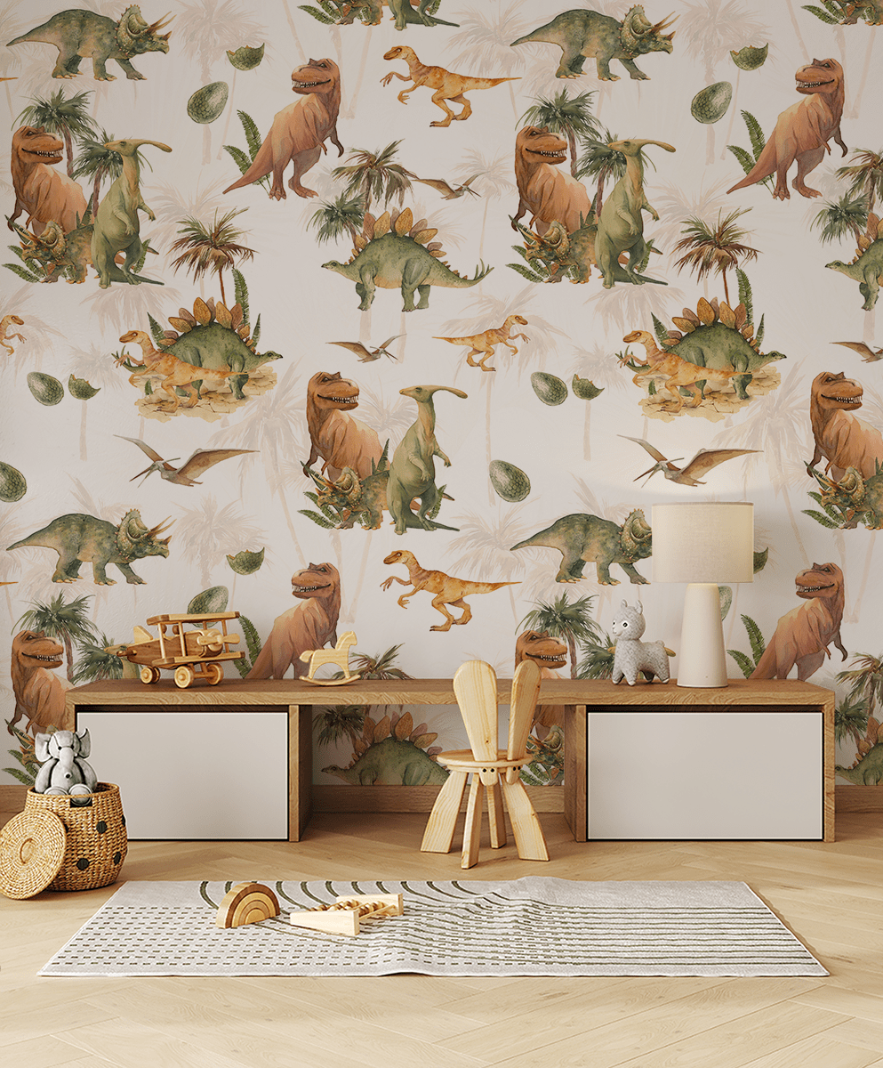 Förvandla ditt barns rum till ett fascinerande land fullt av äventyr med fototapeten ”Djungeldinosaurier”. Detta färgglada, livliga mönster transporterar din lilla till hjärtat av en uråldrig djungel, hem för vänliga dinosaurier, exotiska växter och mystiska dinosaurieägg. Varje detalj har utformats med ett barns fantasi i åtanke – från leende tyrannosaurier till majestätiska stegosaurier och flygande pterosaurier.