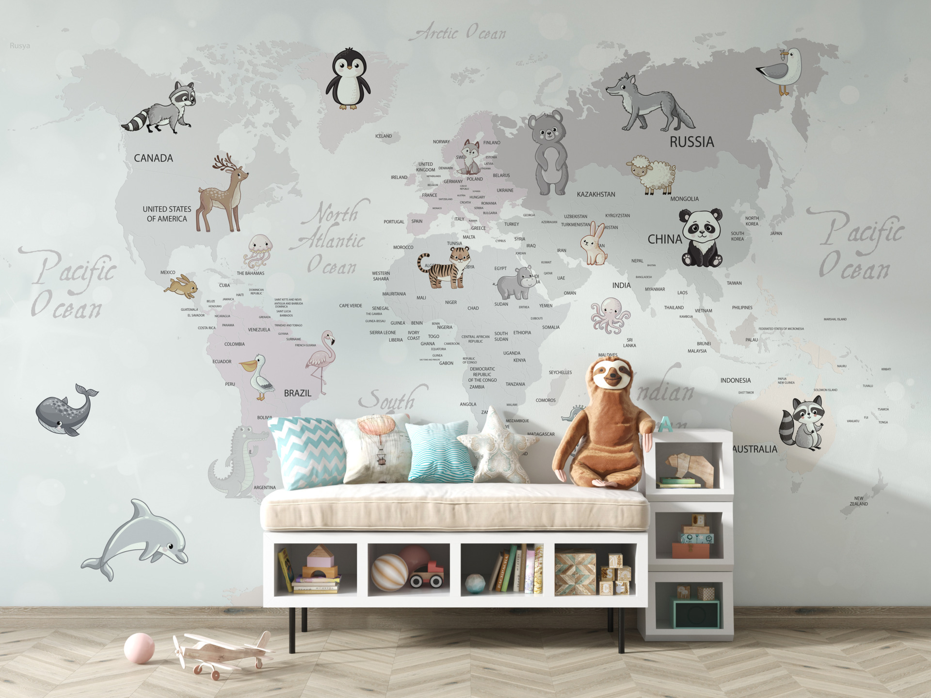 Denna vackra väggmålning är det perfekta sättet att lägga till färg och karaktär i alla rum. Den föreställer en världskarta med en mängd olika djur från hela världen.