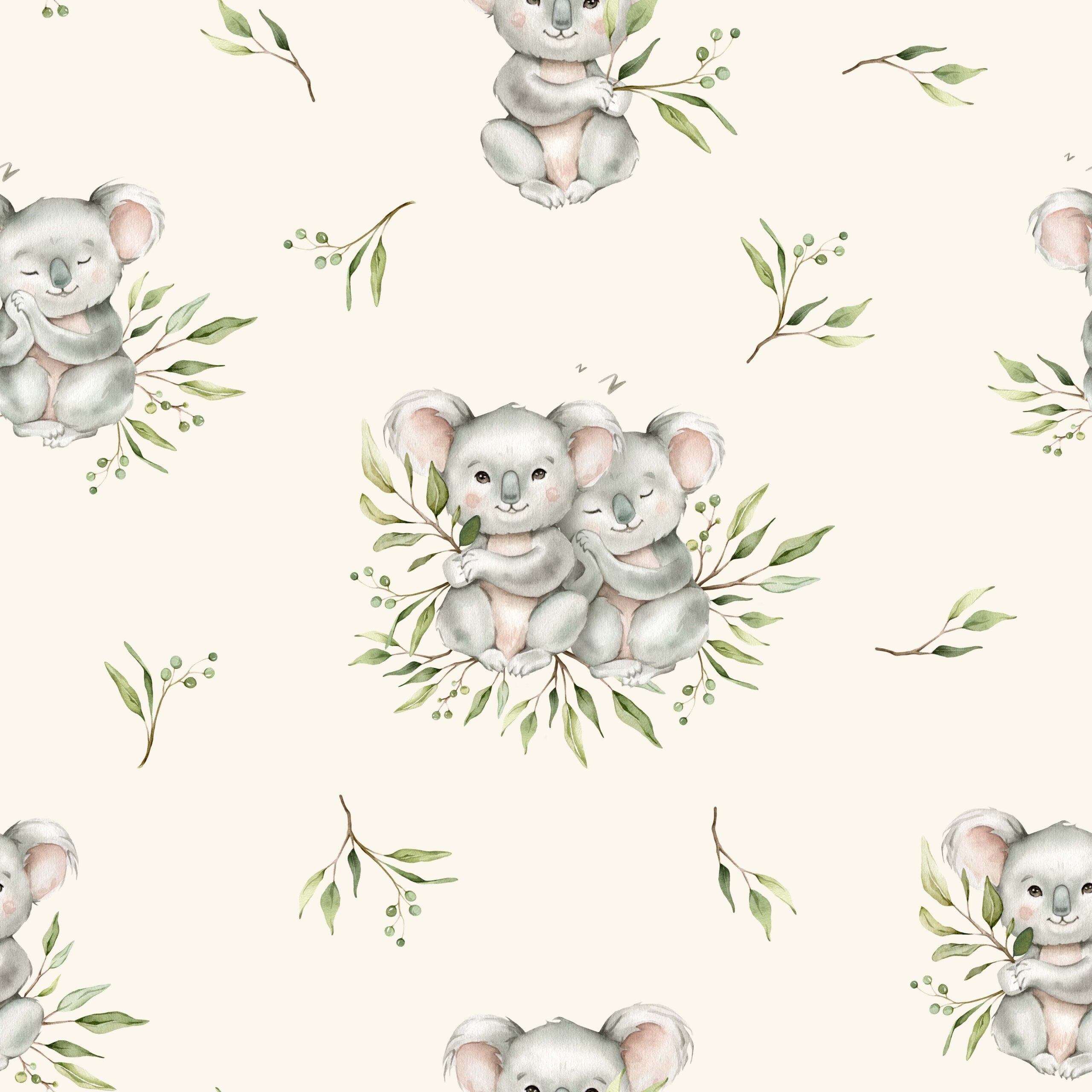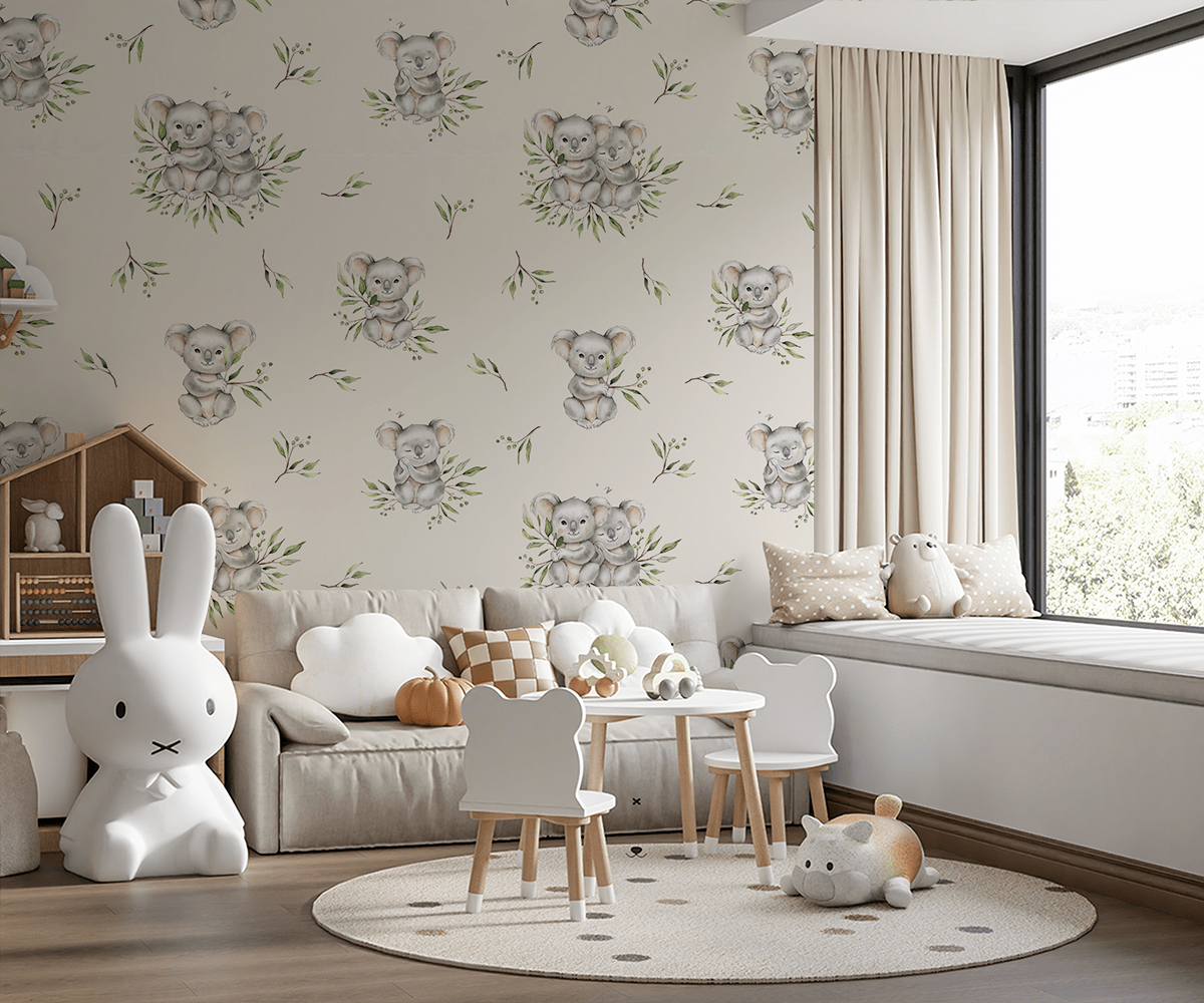 Fototapeten Dream of Eucalyptus – koalornas charmiga värld, stillsam lek och den varma atmosfären i ett barnrum