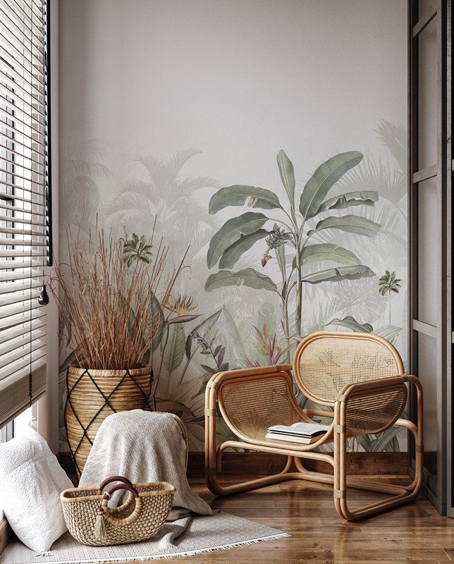 Motivet med exotiska växter livar upp interiören och ger vardagsrummet en unik charm – naturligt, snyggt och tidlöst.