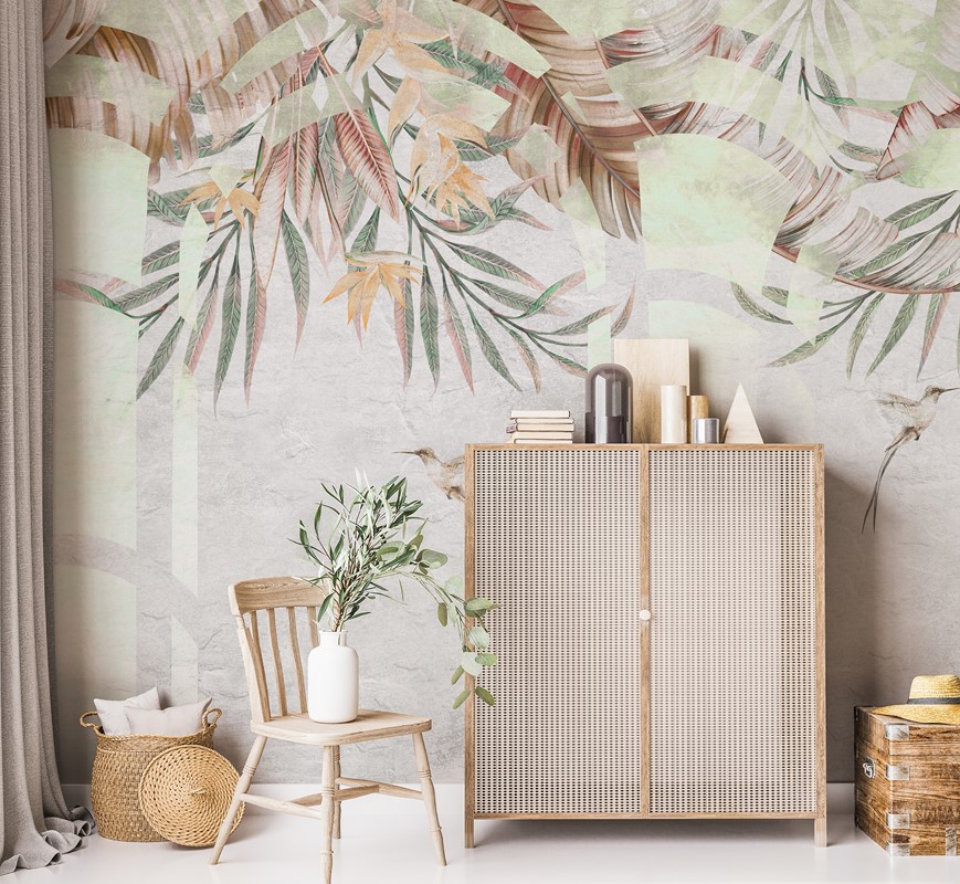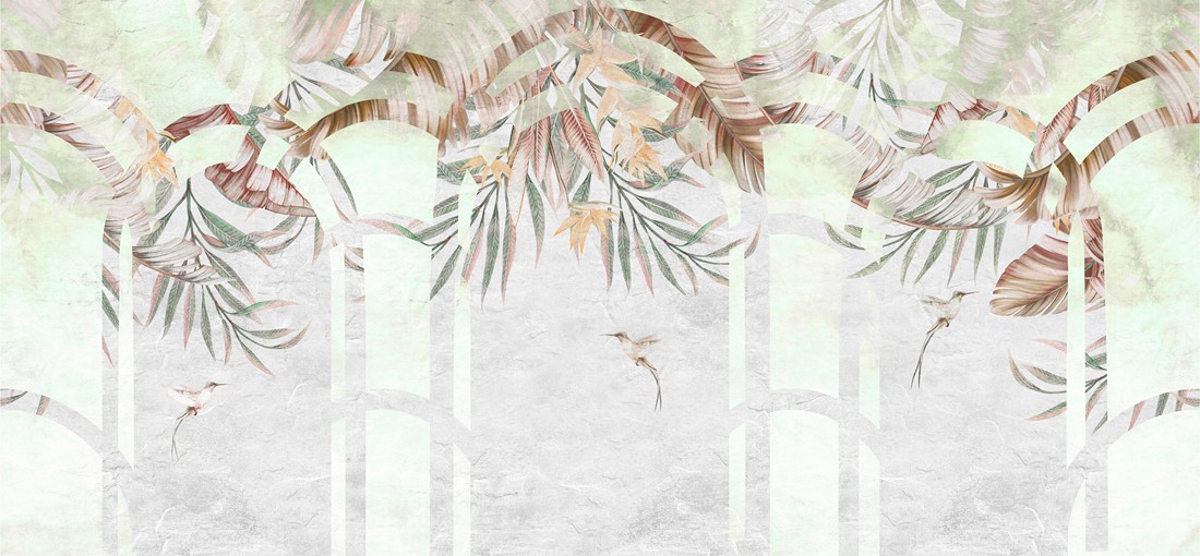 Etiketter: blommor, dekorativa valv, exotiskt, exotiskt i inredningen, fåglar, geometriska valv, sovrumstapet, tropisk lövtapet, tropiska löv, vardagsrumstapet, växter, växttapet