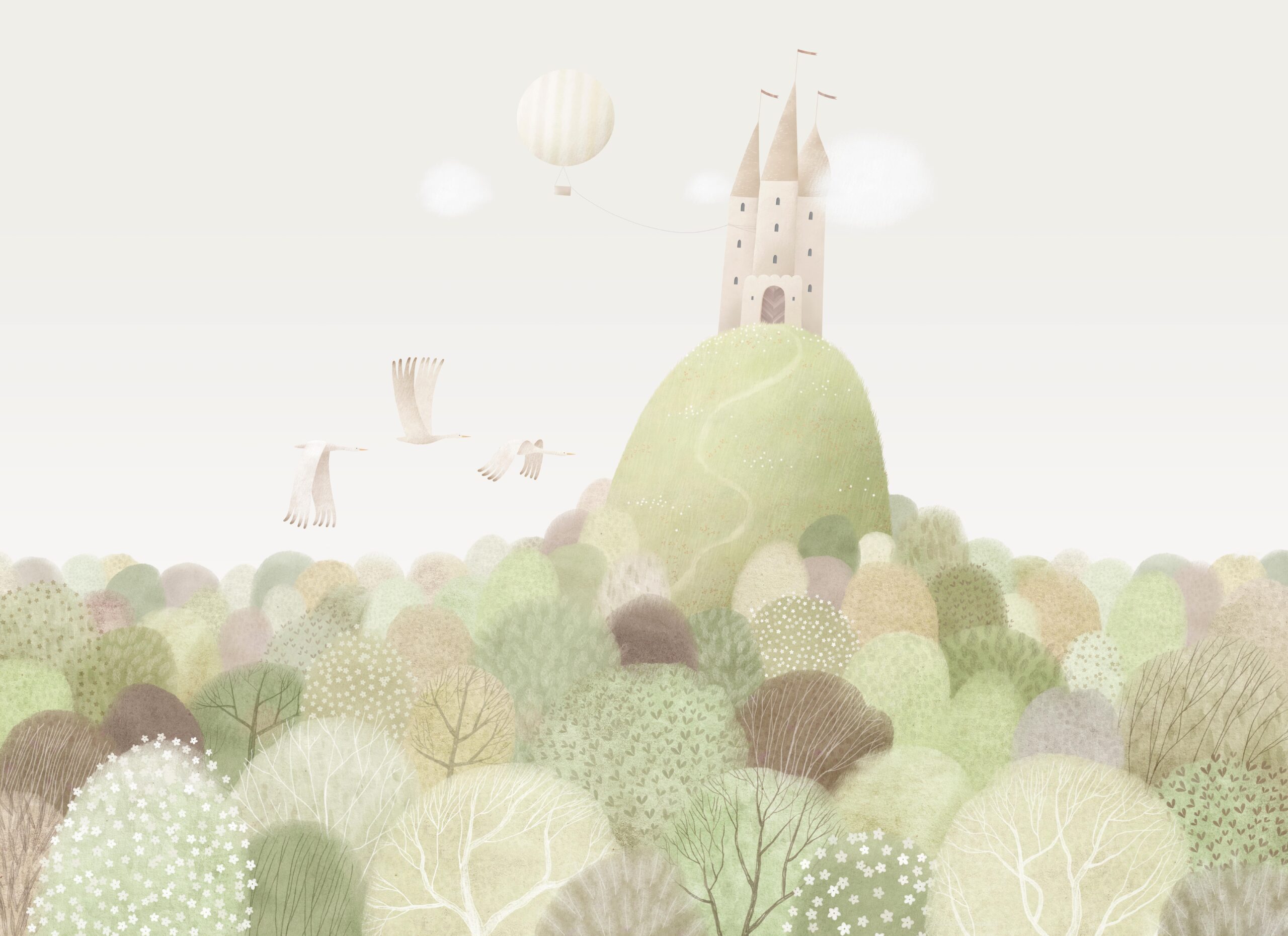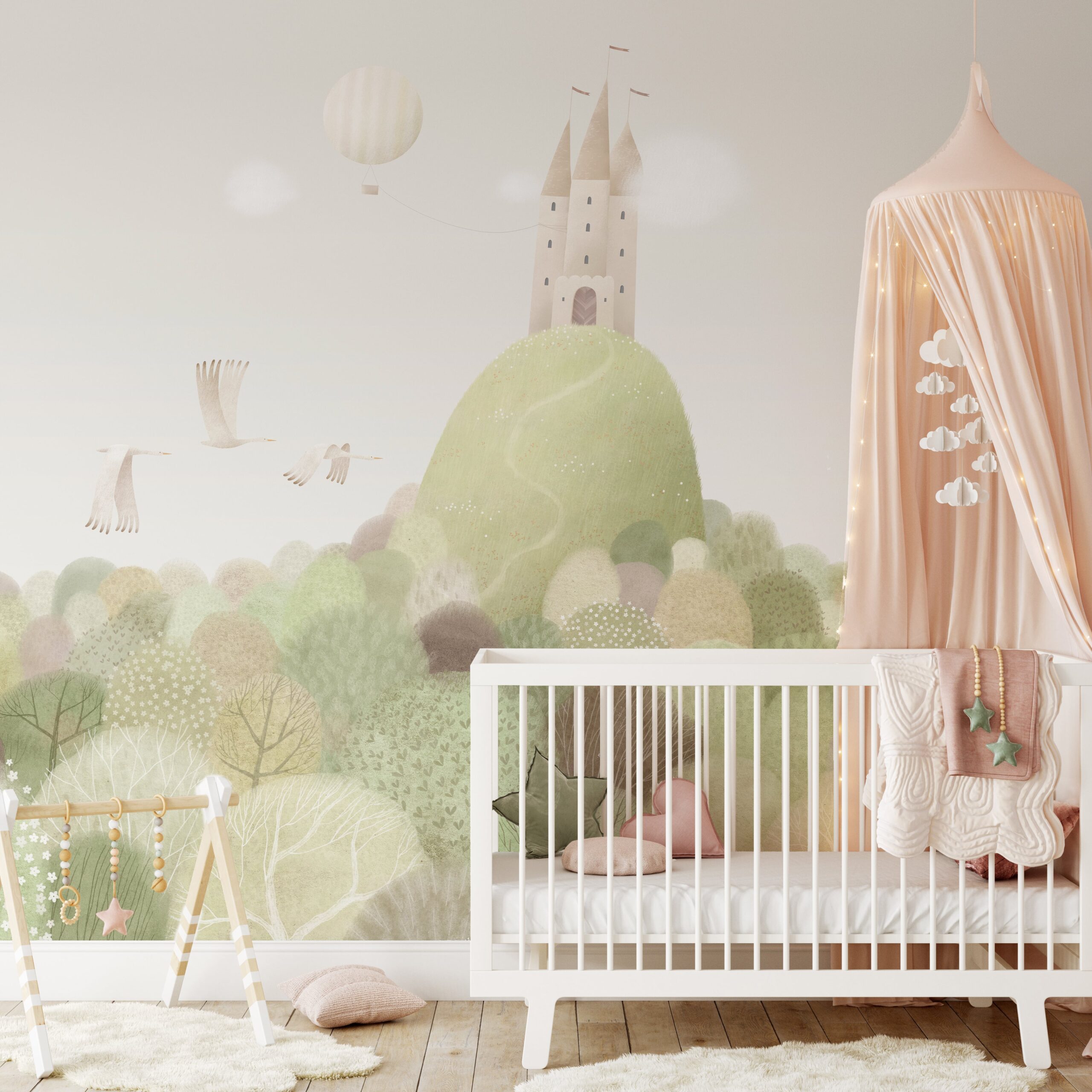 Ge ditt barns rum en unik atmosfär med fototapeten ”Enchanted Grove”. Denna delikata och pastellfärgade scen avbildar en förtrollad skog med ett slott på en kulle, en svävande ballong och skogsfåglar som inbjuder dig att följa med dem på en resa full av fantasi och glädje. Subtila färger och mjuka former skapar en vänlig och fridfull atmosfär, perfekt för barns drömmar och lek.