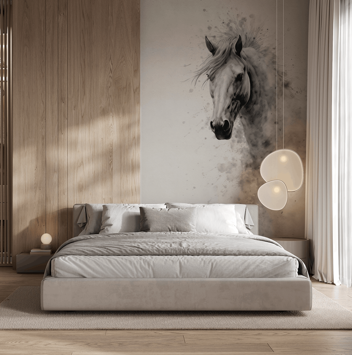Ge din interiör dynamik och frihet med fototapeten ”Shadow of the Gallop”. Denna uttrycksfulla, svartvita bild av en häst, skapad i stil med en akvarellskiss, utstrålar rörelse, styrka och naturlig elegans. Bläckstänk och mjuka tonövergångar ger kompositionen en lätthet, vilket skapar en effekt av flyktighet och konstnärlig underdrift.