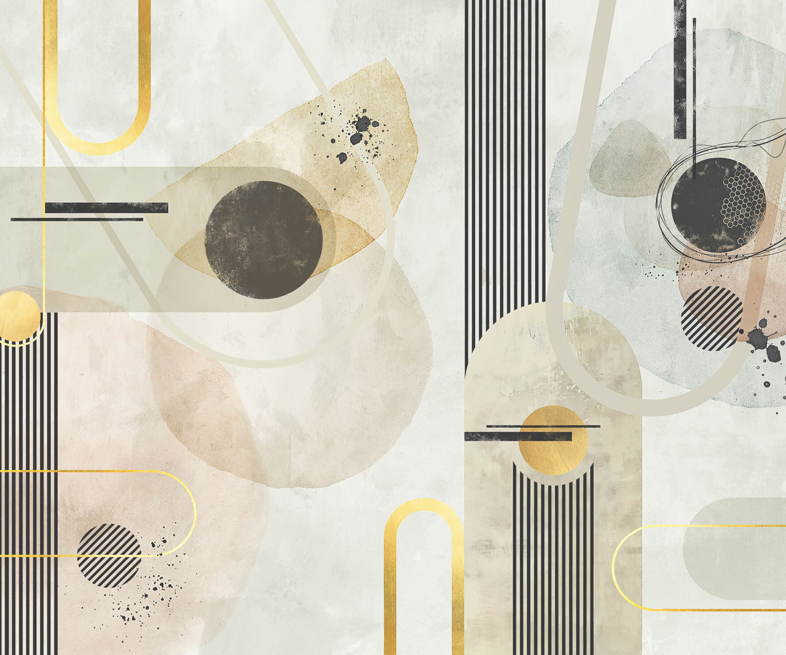 Upptäck skönheten i samtida konst i ditt eget hem med fototapeten ”Geometric Whisper”. Denna unika komposition kombinerar delikata geometriska former med en subtil färgpalett, vilket skapar ett harmoniskt och elegant utrymme som främjar koncentration och avkoppling. Varma beige, dämpade blå och mjuka grå nyanser flätas samman med grafiska linjer, vilket ger interiören en konstnärlig men diskret karaktär.