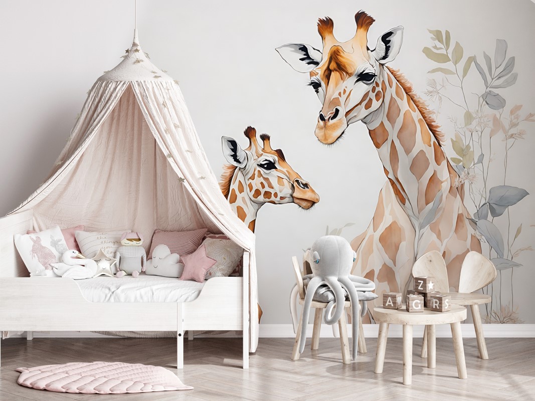 Fototapeten ”Girafffamilj” är ett varmt och charmigt motiv, perfekt för ett barnrum. Den avbildar en familjescen med giraffer i en fridfull, naturlig miljö. Illustrationsstilen är mild, pastellfärgad och behaglig för ögat, vilket skapar ett mysigt och harmoniskt utrymme för barn. Mönstret utstrålar glädje och väljs ofta som ett inredningselement i skandinavisk, bohemisk barnstil eller idyllisk barnstil.