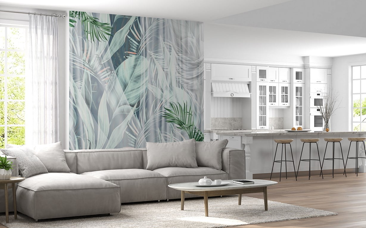 Denna väggmålning är perfekt för vardagsrummet, sovrummet, kontoret eller matsalen och ger rummet ett fräscht och naturligt utseende. Med sitt mönster av gröna blad bakom gardinen skapar du en behaglig atmosfär av avkoppling i ditt eget hem.