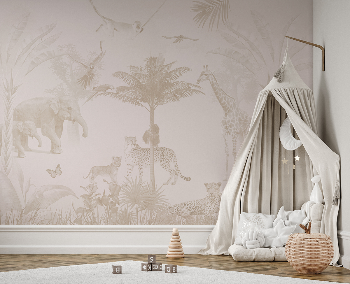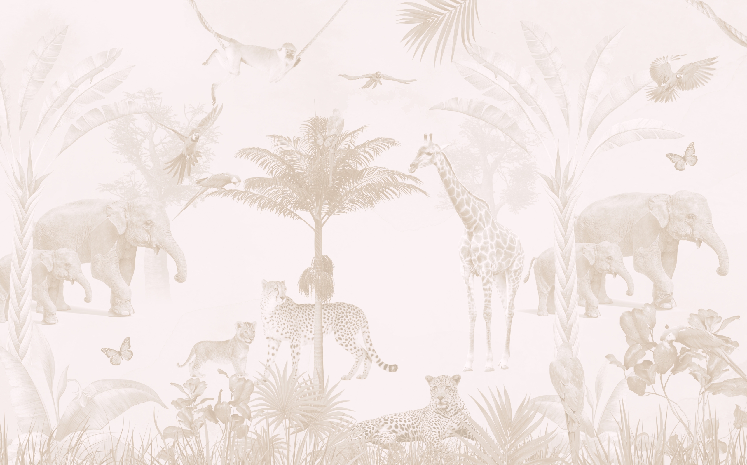 Ta in värmen från den exotiska naturen i ditt utrymme med kompositionen ”Harmonia Safari”. Det är en delikat, konstnärlig illustration inspirerad av den afrikanska savannen, där majestätiska elefanter, värdiga giraffer, smidiga leoparder och färgglada fåglar möts bland frodig tropisk vegetation. Dekorerad i beige och sepia toner utstrålar den lugn, lätthet och naturlig elegans.