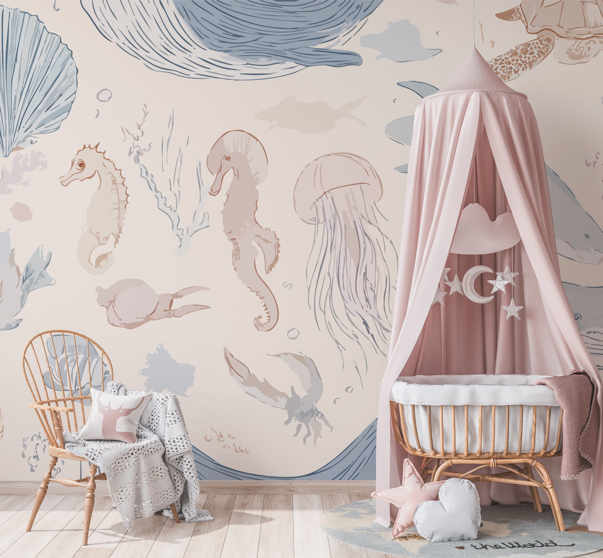 Detta är det perfekta alternativet för småttingar som älskar att upptäcka havets hemligheter. Fototapeten kommer att ge ditt barns rum en glädjefylld energi och skapa ett utrymme fullt av magi och fantasi. Den passar perfekt till leksaker, en säng eller ett skrivbord, och betonar interiörens mysiga karaktär.