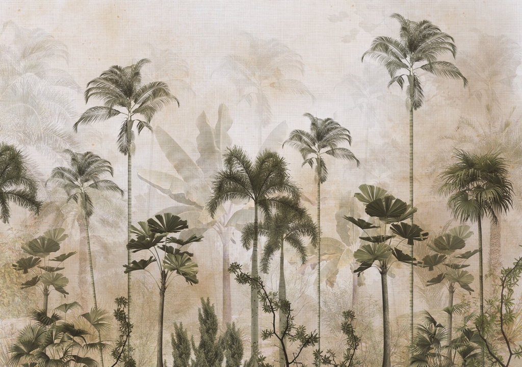 Denna väggmålning har höga palmer som ser vackra ut bakom den lätta dimman som flyter i bakgrunden. Detta mönster kommer att få dig att känna dig som om du har förflyttats till en strand i paradiset, där solen skiner försiktigt genom palmgrenarna.