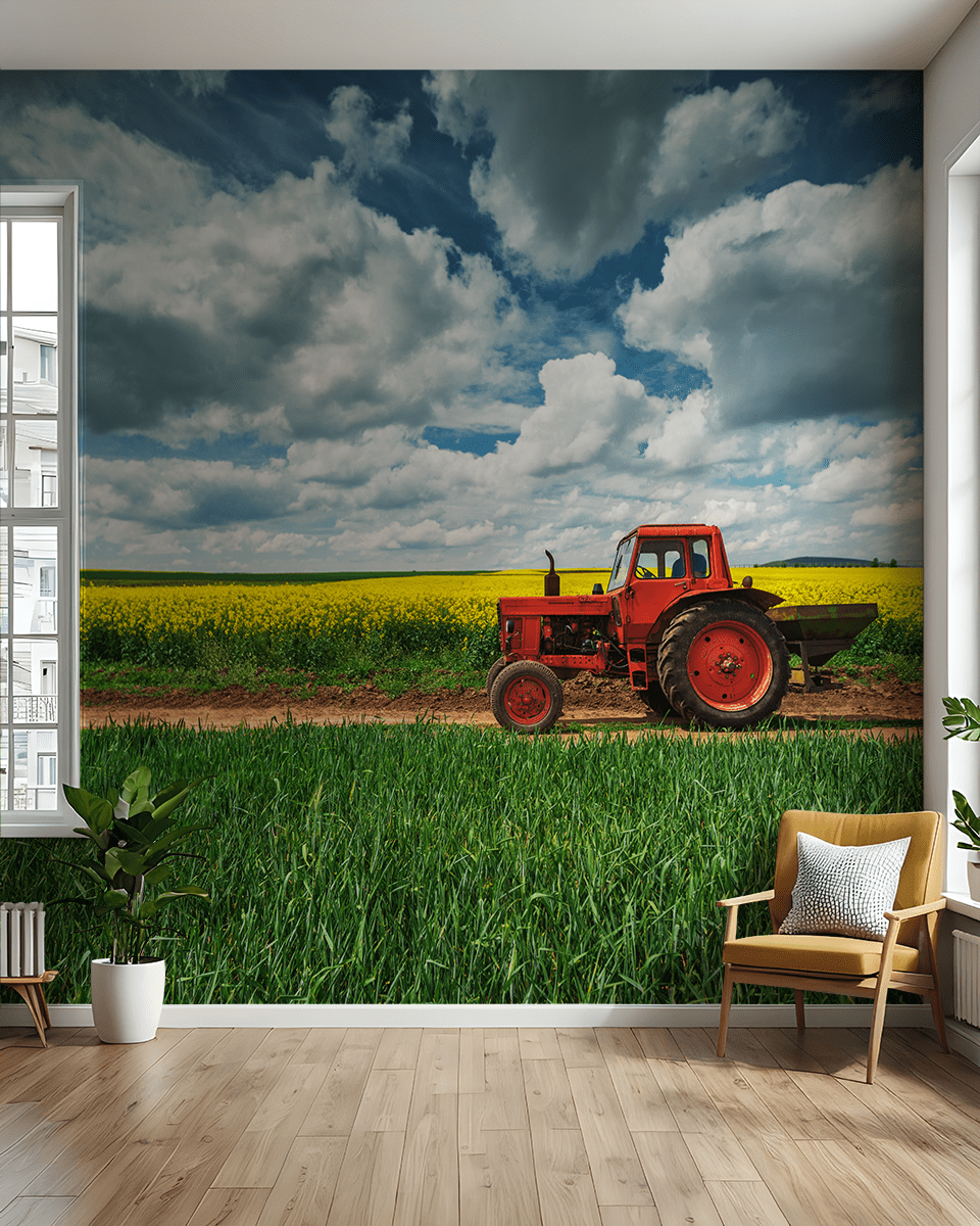 Ta med lite lantlig idyll till ditt hem med fototapeten ”I hjärtat av fältet”. Denna charmiga bild, som föreställer en pittoresk utsikt över grönt gräs, gula fält och en distinkt röd traktor, fångar perfekt naturens lugn och harmoni. Moln mot himlen ger lätthet och öppenhet till rummet och skapar en atmosfär full av fräschör och naturlig skönhet.