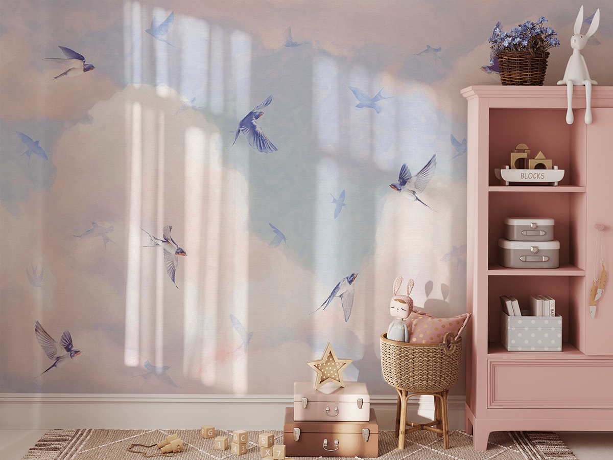 Skapa ett verkligt magiskt utrymme i ditt barns rum med fototapeten ”I molnens omfamning”. Detta charmiga pastellmönster med svalor som glider över en mjuk, rosa och blå himmel introducerar en atmosfär av lätthet, frid och barnslig fantasi. Subtila färger och en delikat komposition gör interiören varm, mysig och full av sagolik charm.
