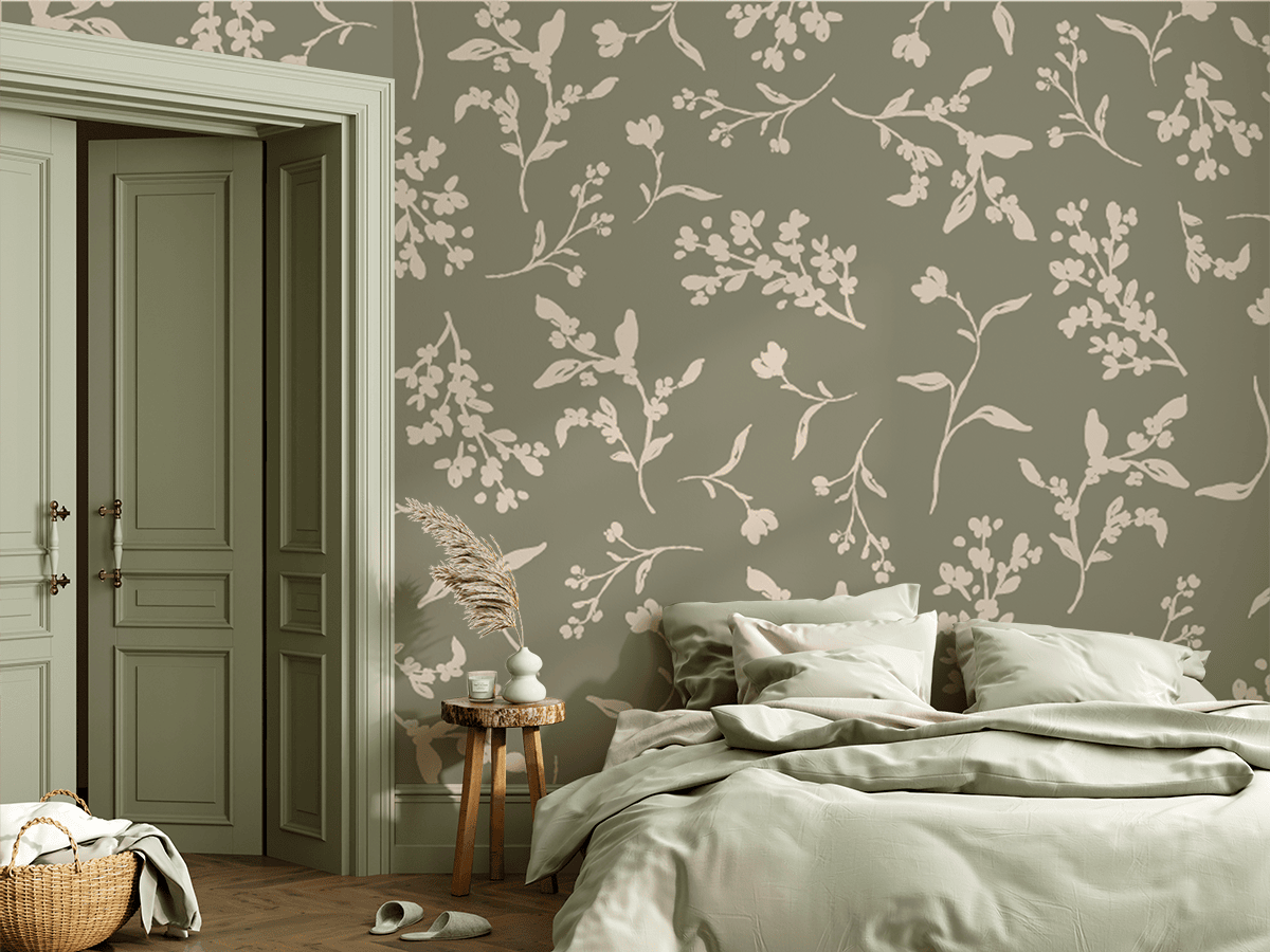 Skapa en atmosfär av lugn och ro i ditt hem med fototapeten ”Whisper of Twigs”. Detta subtila mönster med ljusa, botaniska motiv på en matt bakgrund i en nyans av dämpad grön skapar en unik komposition inspirerad av naturens lugn. Handritade kvistar och delikata blommor ger lätthet och naturlig finess till utrymmet.
