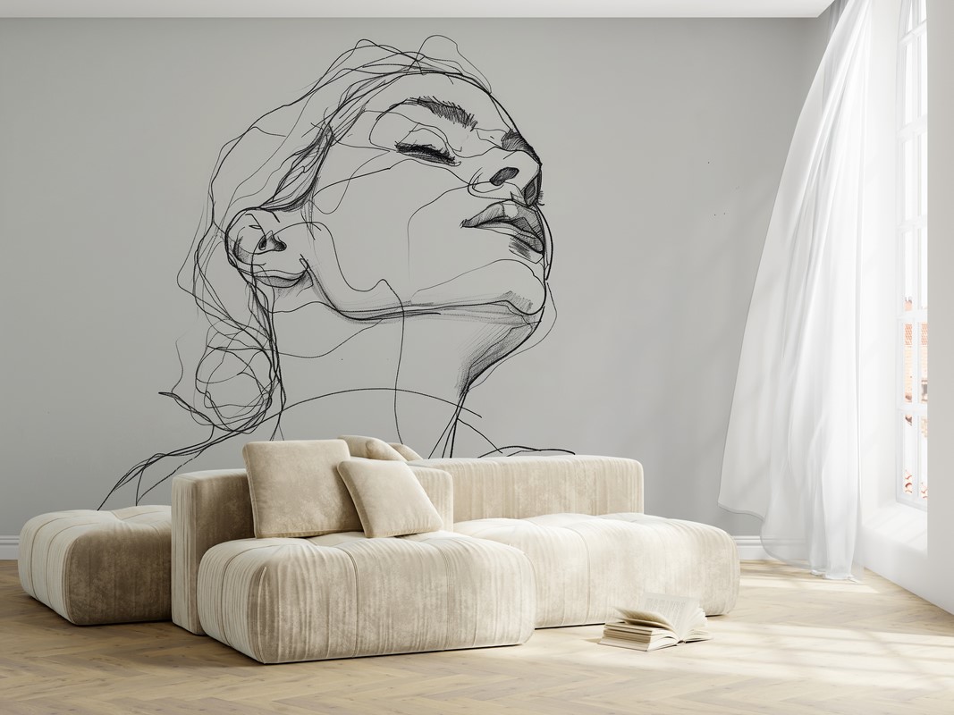 Tapeten ”Linjär skiss av en kvinnas ansikte” – minimalistiskt uttryck, konstnärlig precision och modern elegans