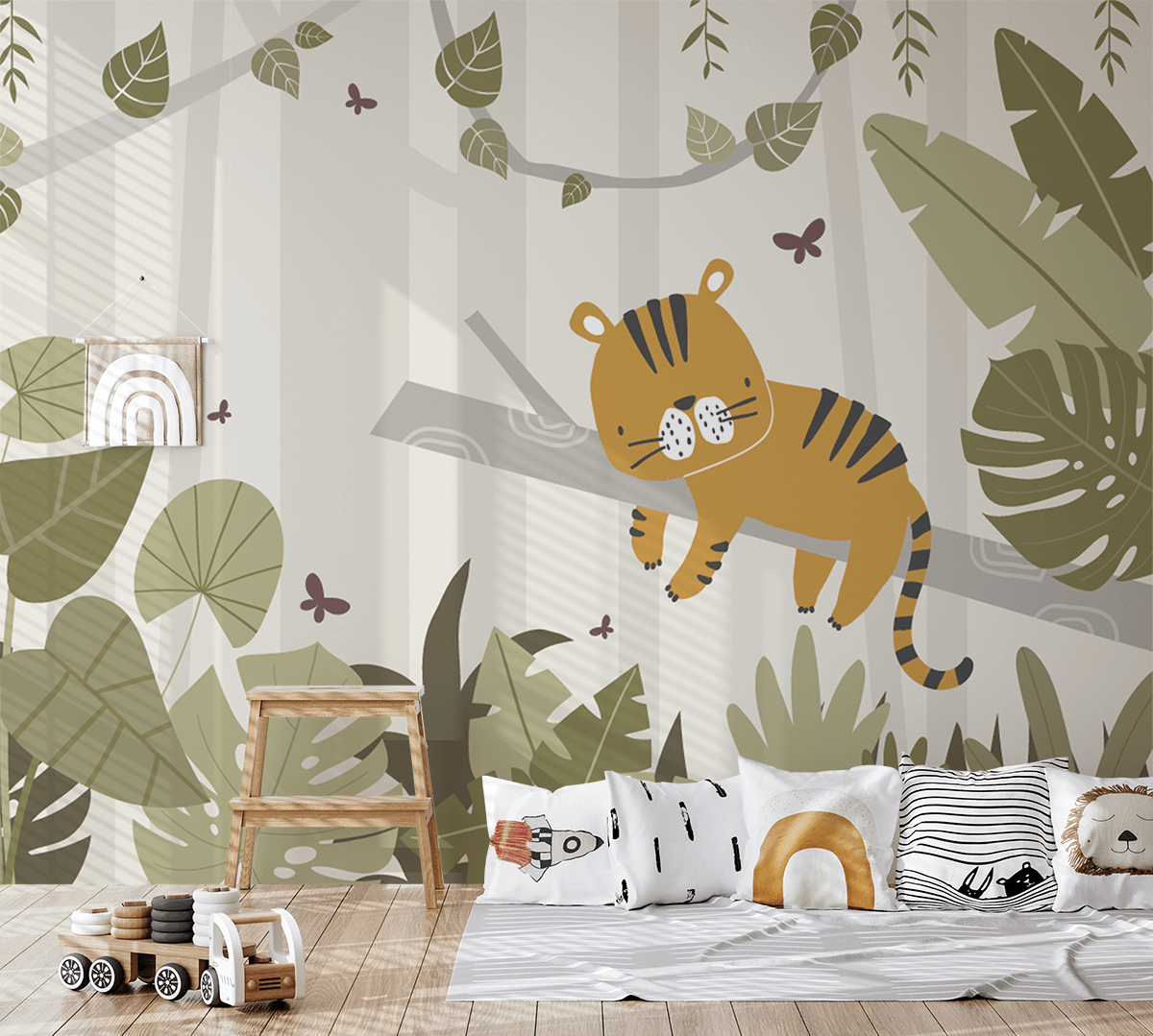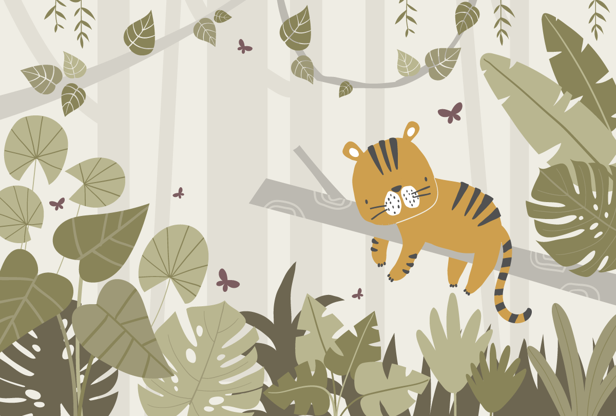 Ta med en magisk värld till ditt barns rum med fototapeten ”Liten tiger i den gröna skogen”. Denna charmiga, färgglada bild avbildar en liten tiger som vilar på en gren omgiven av gröna löv och fjärilar, vilket skapar en vänlig och fridfull atmosfär full av äventyr och skoj. Delikata färger och ett behagligt mönster gör denna fototapet perfekt för barnrum, förskolor eller lekplatser.