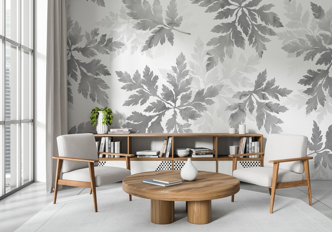 Grafiken kännetecknas av subtilitet och raffinerad lugn: bladen betraktas som genom en dimma och arrangerar sig delikat i ett lugnt mönster som introducerar optiskt djup och elegans.. Tack vare sina dämpade färger passar fototapeten både i vardagsrum – vardagsrum, sovrum – och kontorsutrymmen, där neutrala bakgrunder och en minimalistisk stil dominerar.