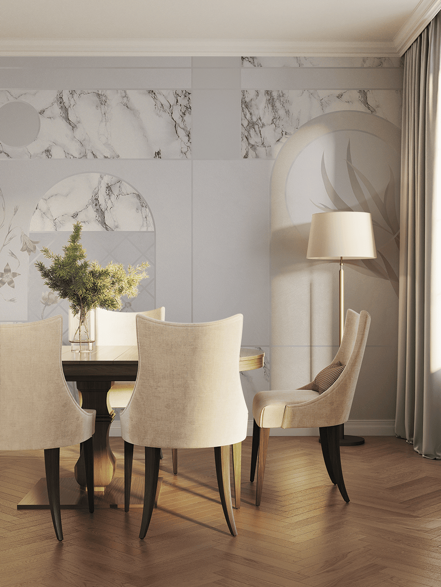 Ge ditt hem tidlös charm med fototapeten ”Marble Harmony”. Detta delikata, marmorinspirerade mönster kombinerar elegans med subtila växtgrafik, vilket skapar ett utrymme fullt av lugn och sofistikerad stil. Kombinationen av marmoraccenter med delikata växtmotiv i dämpade färger ger lätthet och modern elegans till inredningen.
