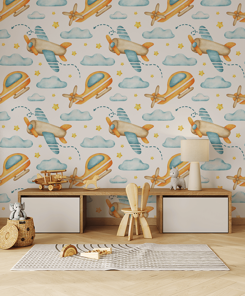 Inför en magisk atmosfär i ditt barns rum med fototapeten ”Cloud Flights”. Denna charmiga akvarellgrafik med flygplan, mjuka moln och stjärnor kommer att transportera din lilla till en värld av bekymmerslösa flygningar och drömmar om himlen. Ljusa, varma färger och fina detaljer skapar ett utrymme fullt av glädje och fantasi, perfekt för ett barnrum eller lekhörna.