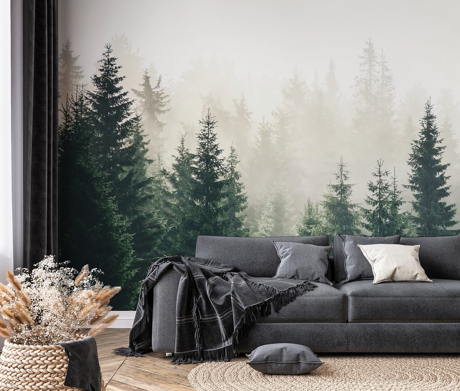Etiketter: dimmig skog, fred, grönska, mystisk skog, naturdekoration, naturtapeter, skog, skogsatmosfär, sovrumstapeter, stillhet, träd, Vardagsrumstapeter