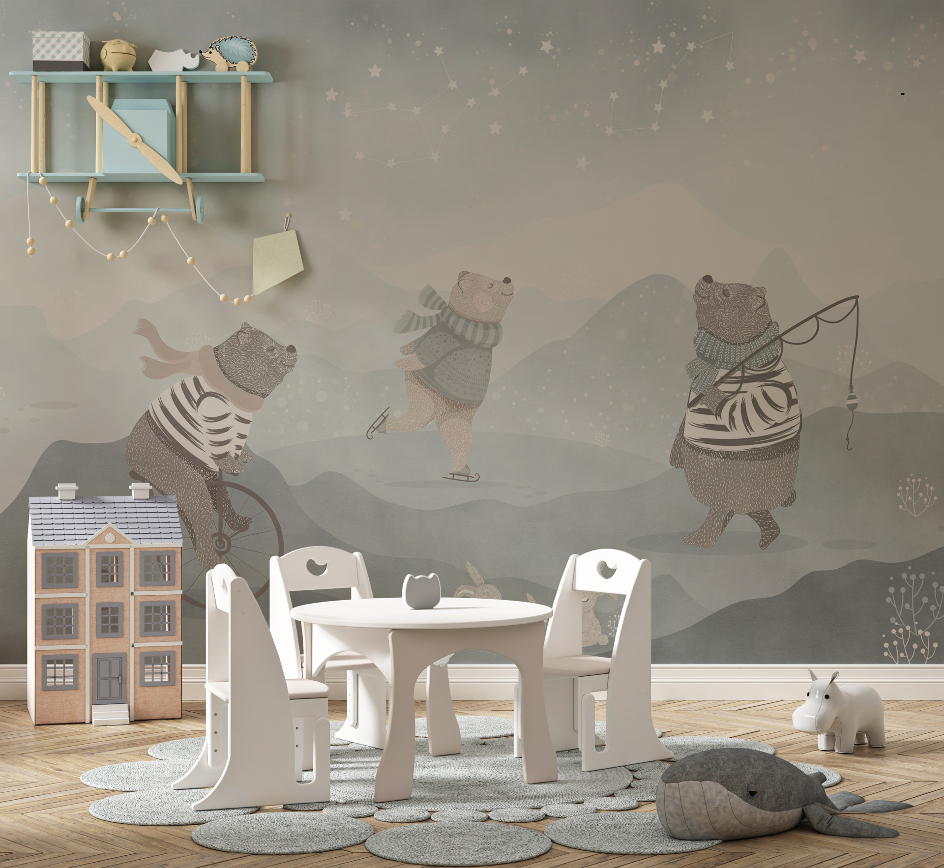 Denna bedårande väggmålning föreställer en grupp nallebjörnar som bär färgglada halsdukar för extra charm och värme. Perfekt för barnrummet eller andra rum där du vill tillföra en touch av lekfullhet och charm.