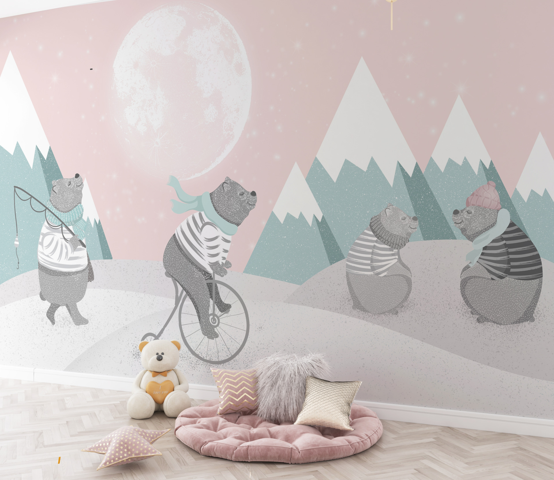 Ett landskap med nallebjörnar på ferian gör varje interiör magisk och varm. Tack vare det professionella utförandet kommer väggmålningen att vara det perfekta dekorativa elementet för alla rum och ge det en unik karaktär.
