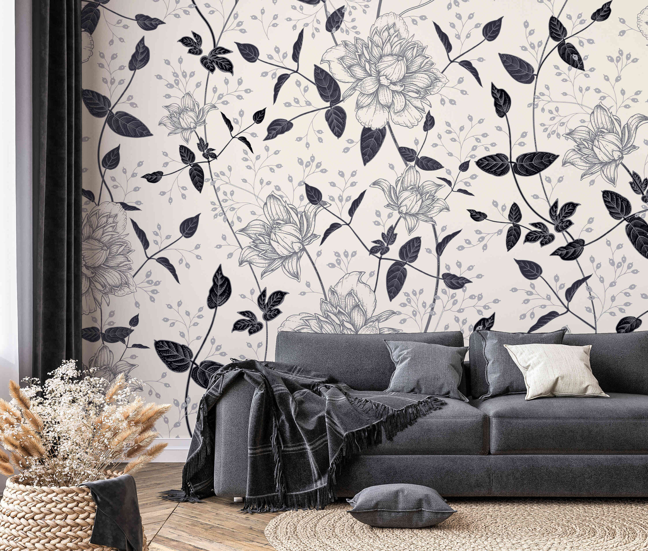 Fototapet ”Night Petals” är ett unikt mönster som kombinerar klassisk elegans och delikatessen hos naturliga blommotiv. Det svartvita, intrikat utformade mönstret påminner om handritade botaniska gravyrer och ger lugn, harmoni och en tidlös stil till interiören.